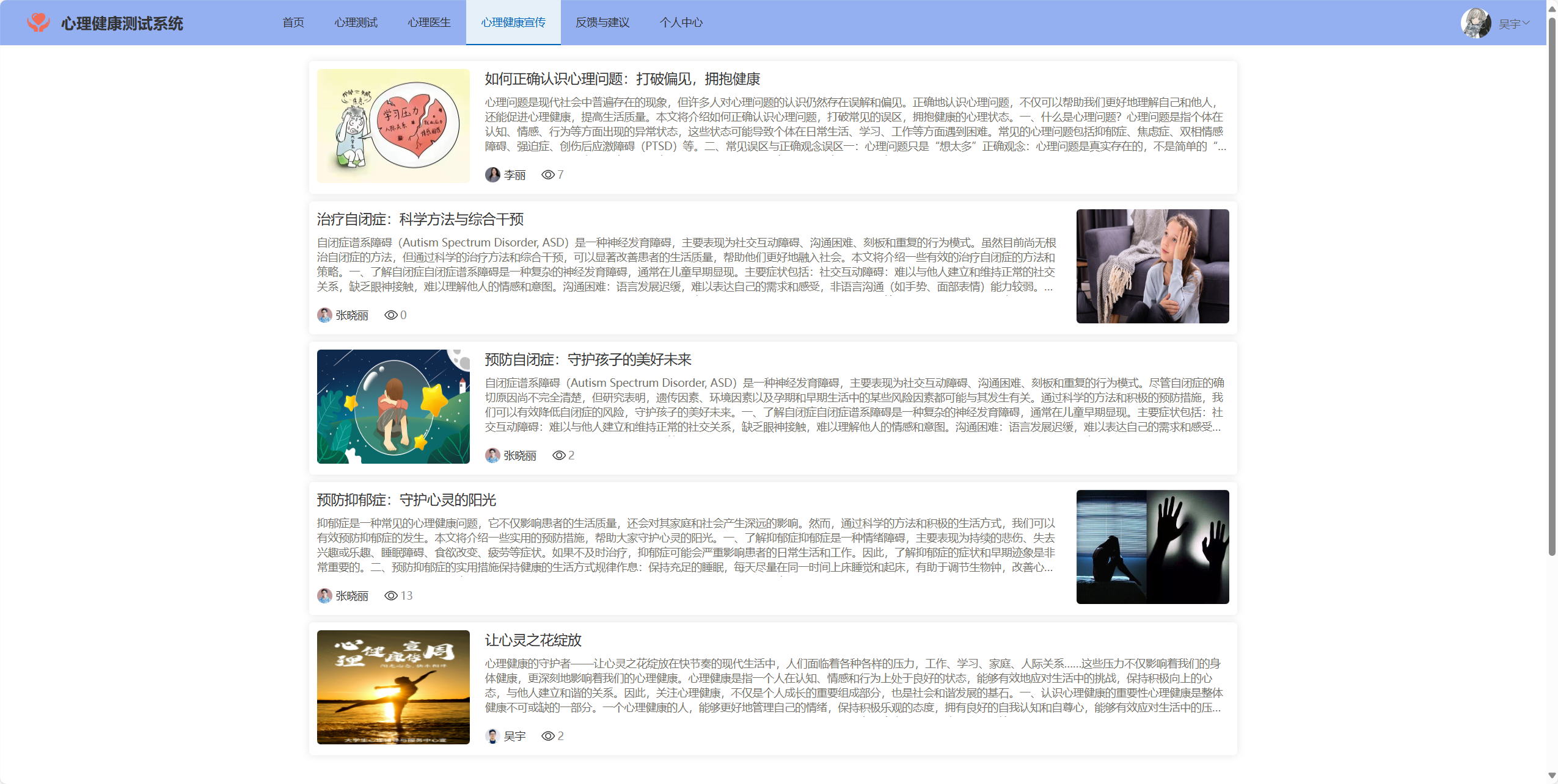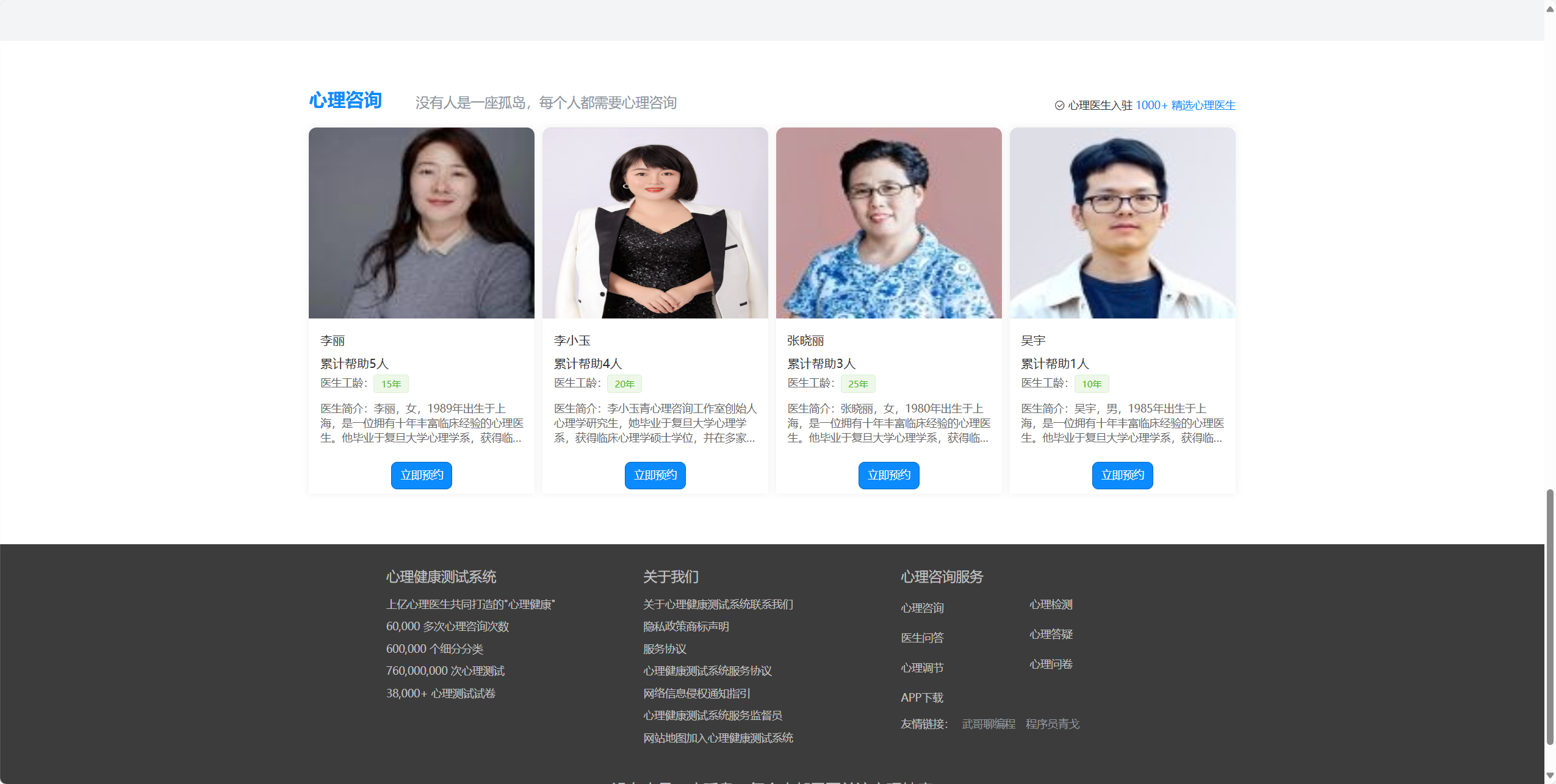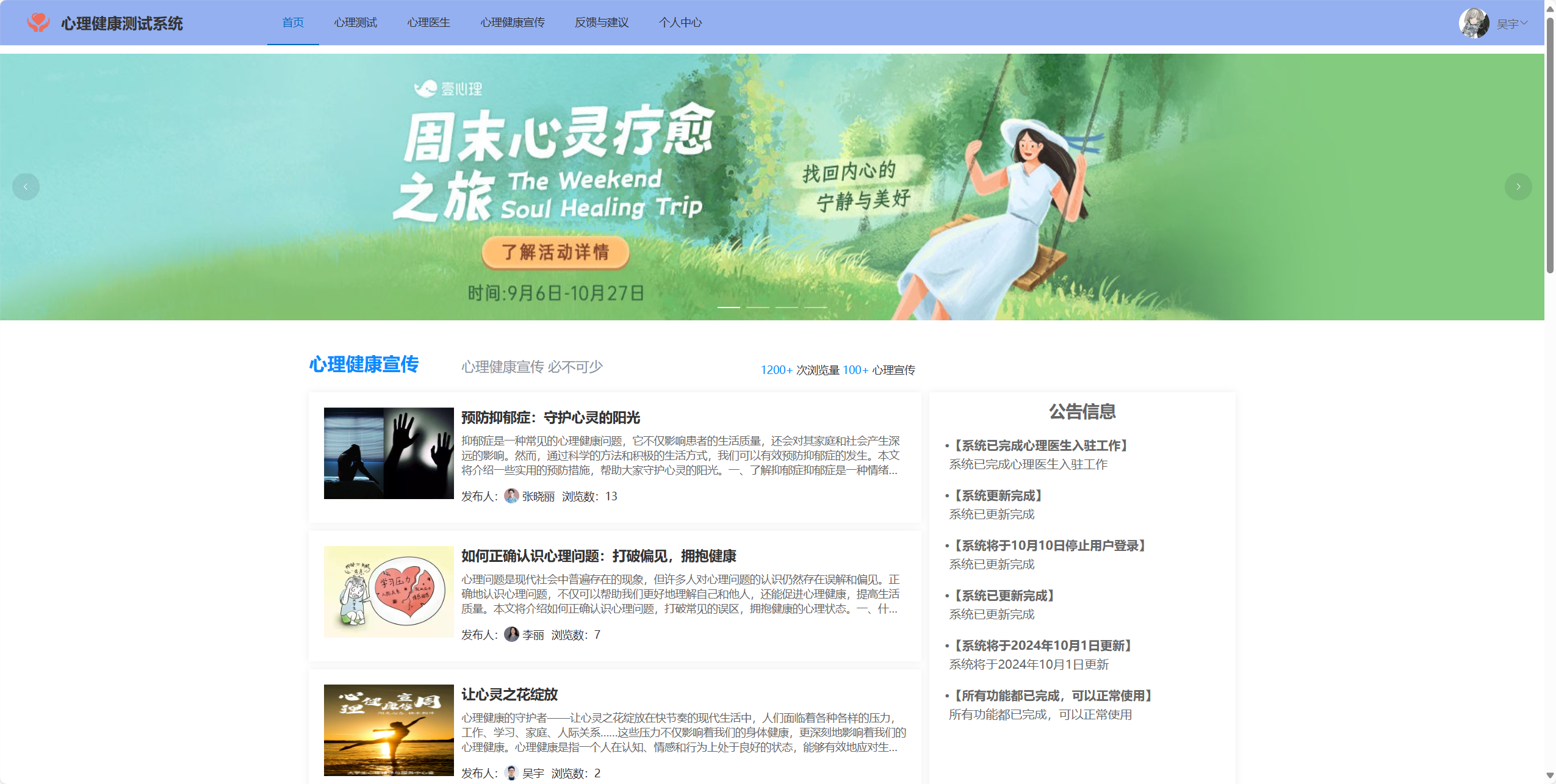 首页:浏览系统公告、首页轮播图、心理健康宣传、心理医生信息、心理测试试卷