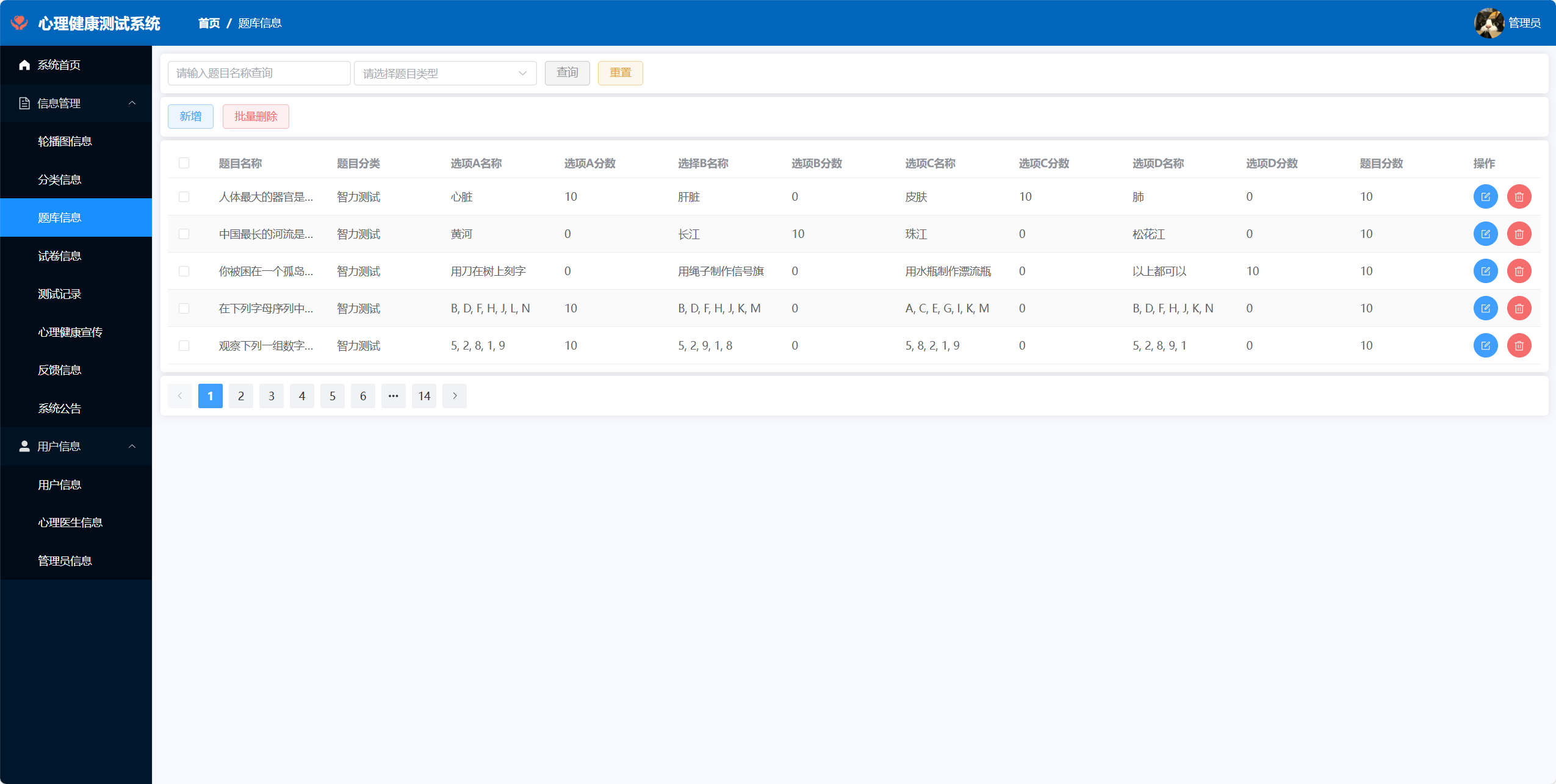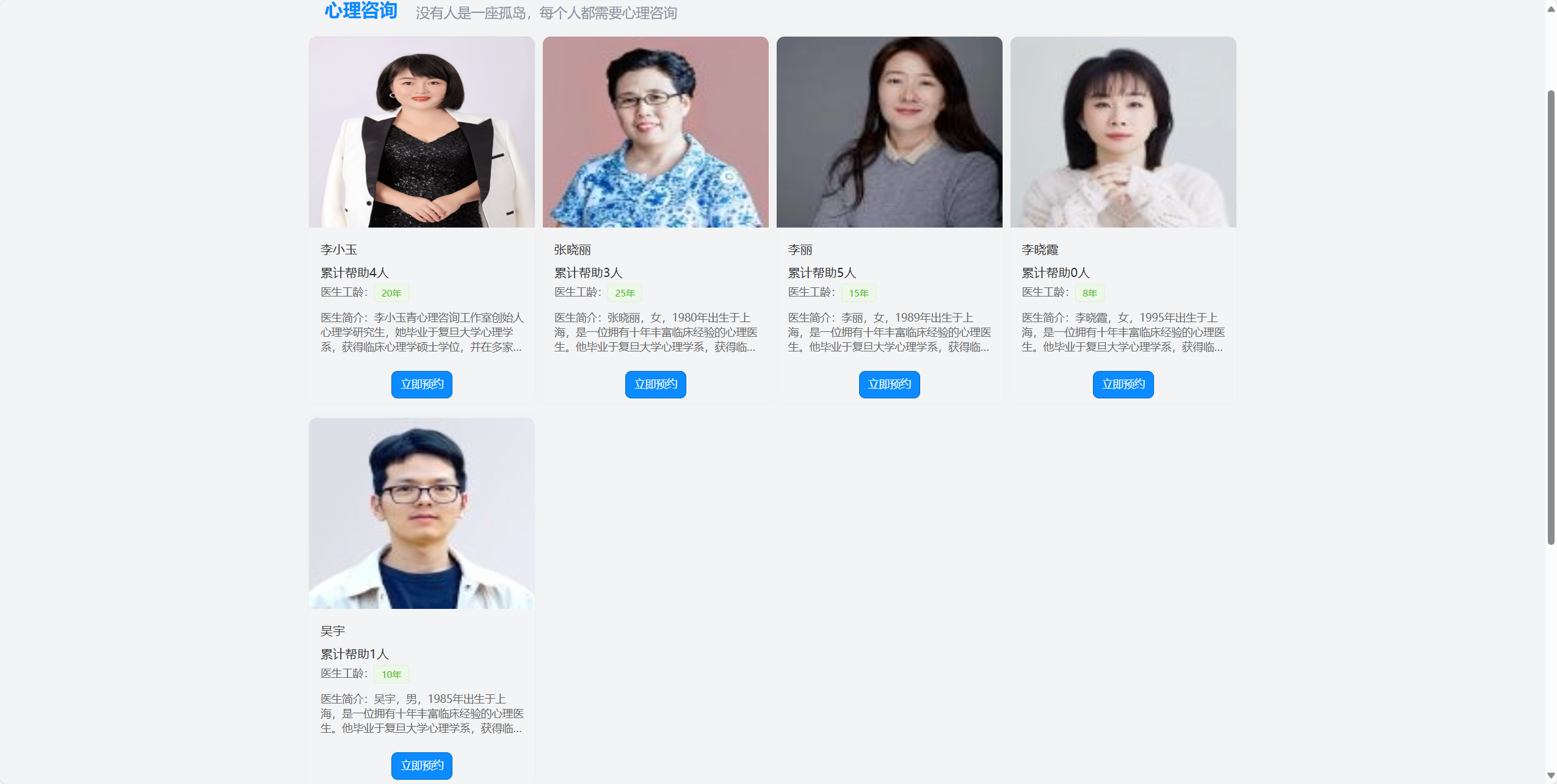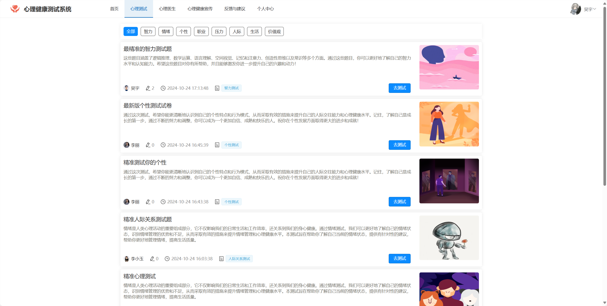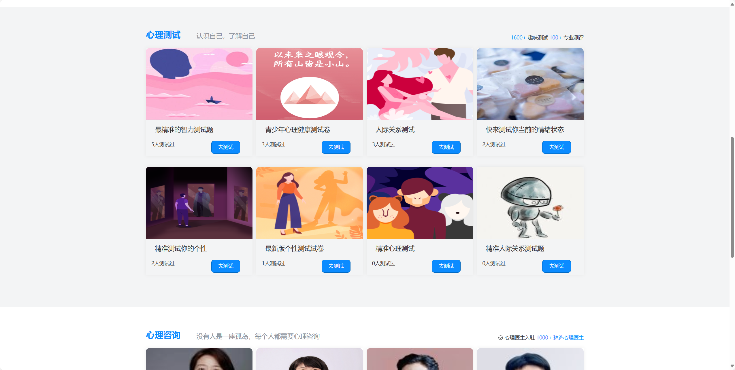 首页:浏览系统公告、首页轮播图、心理健康宣传、心理医生信息、心理测试试卷