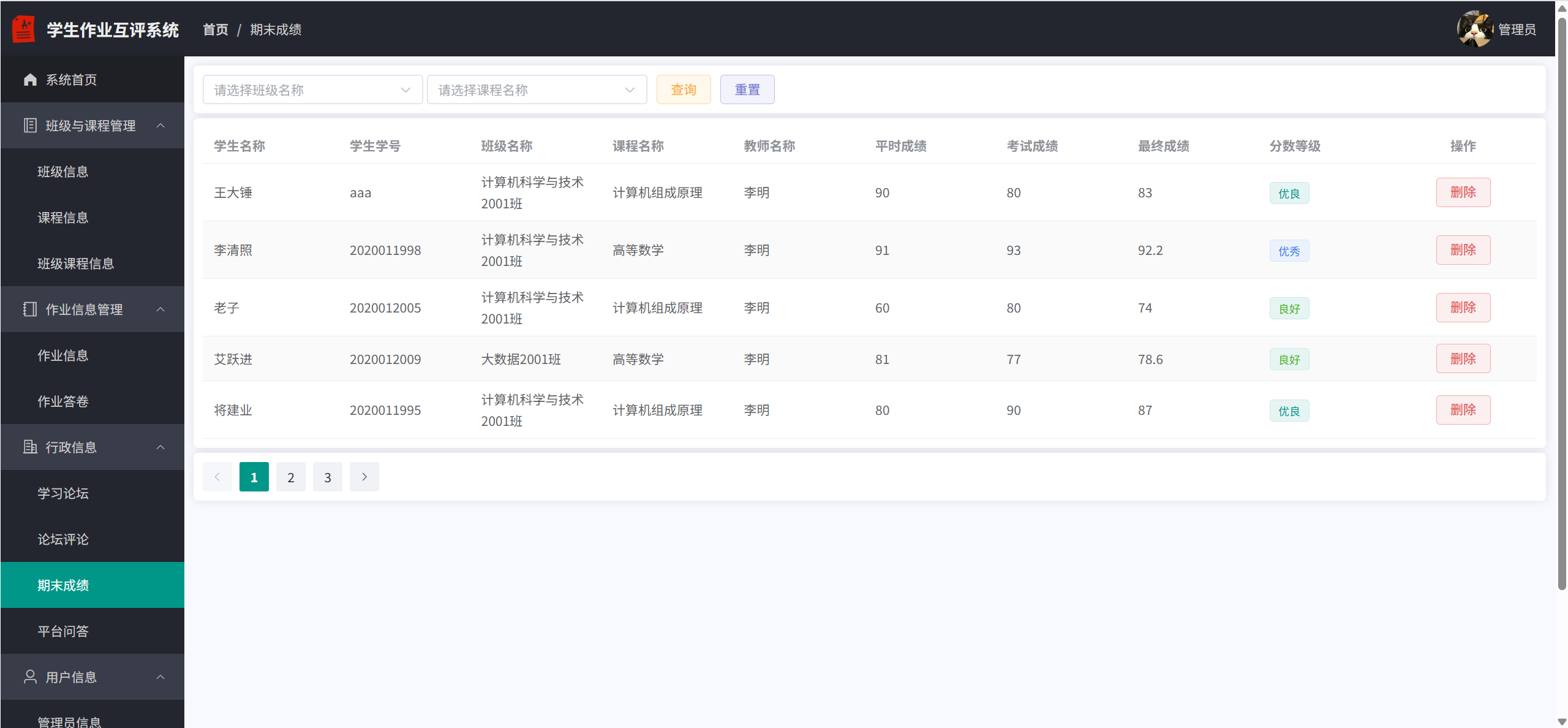 期末成绩:提交由该教师教授课程的学生期末成绩