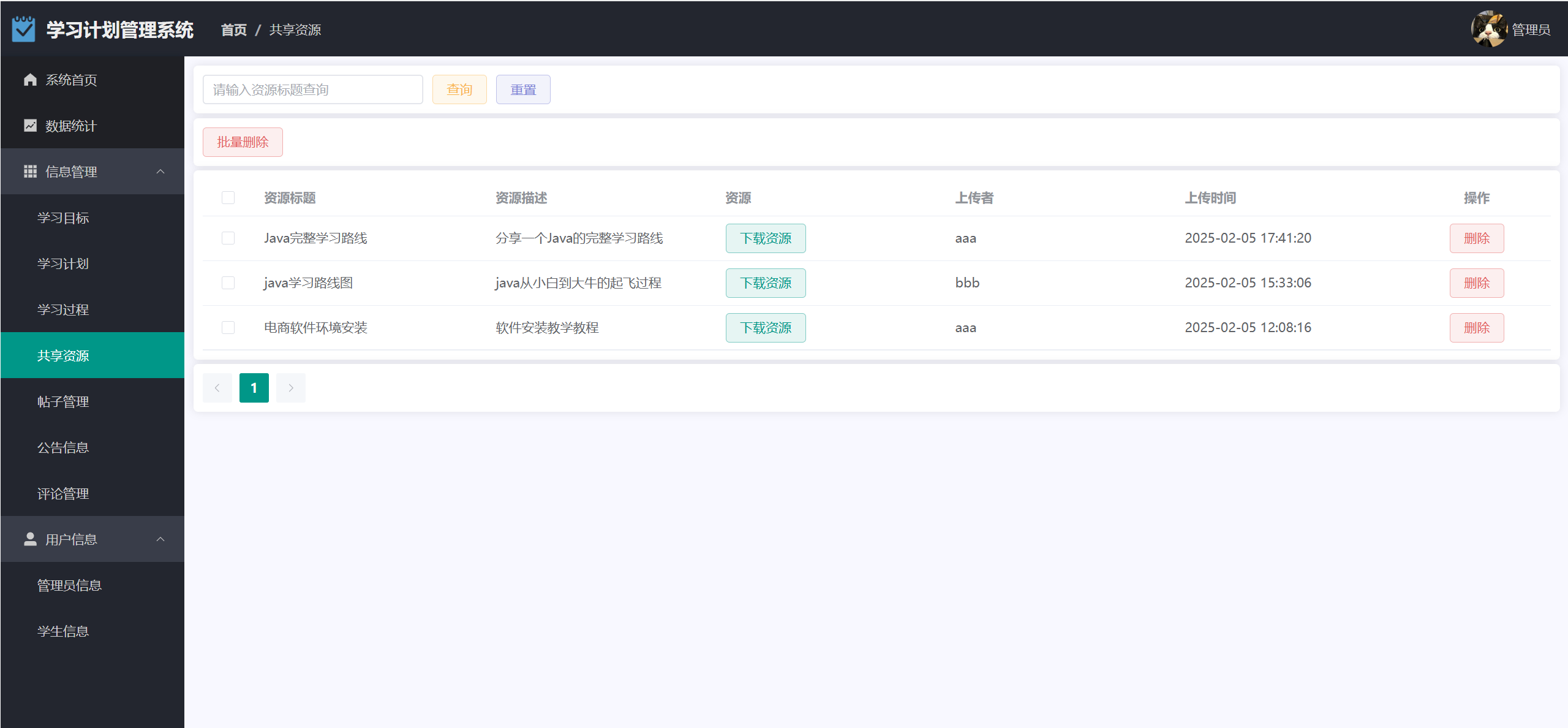 共享资源:查看和管理我上传的资源,查看和下载他人上传的资源