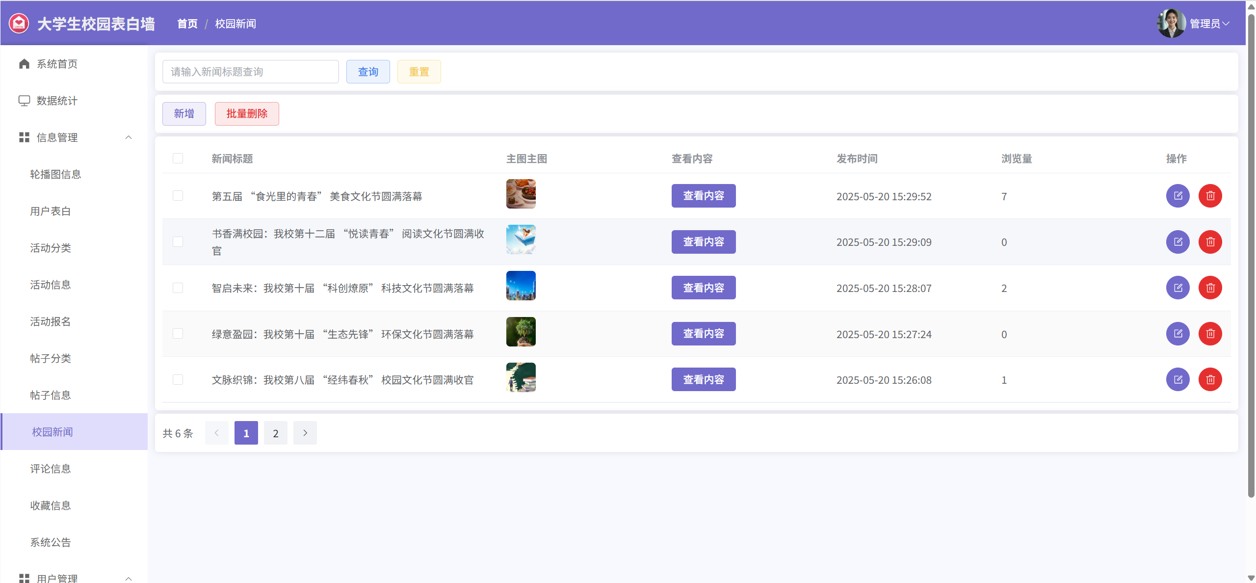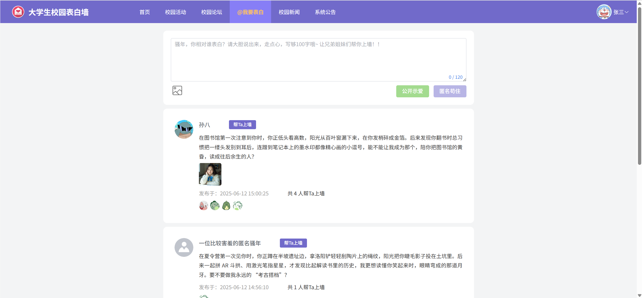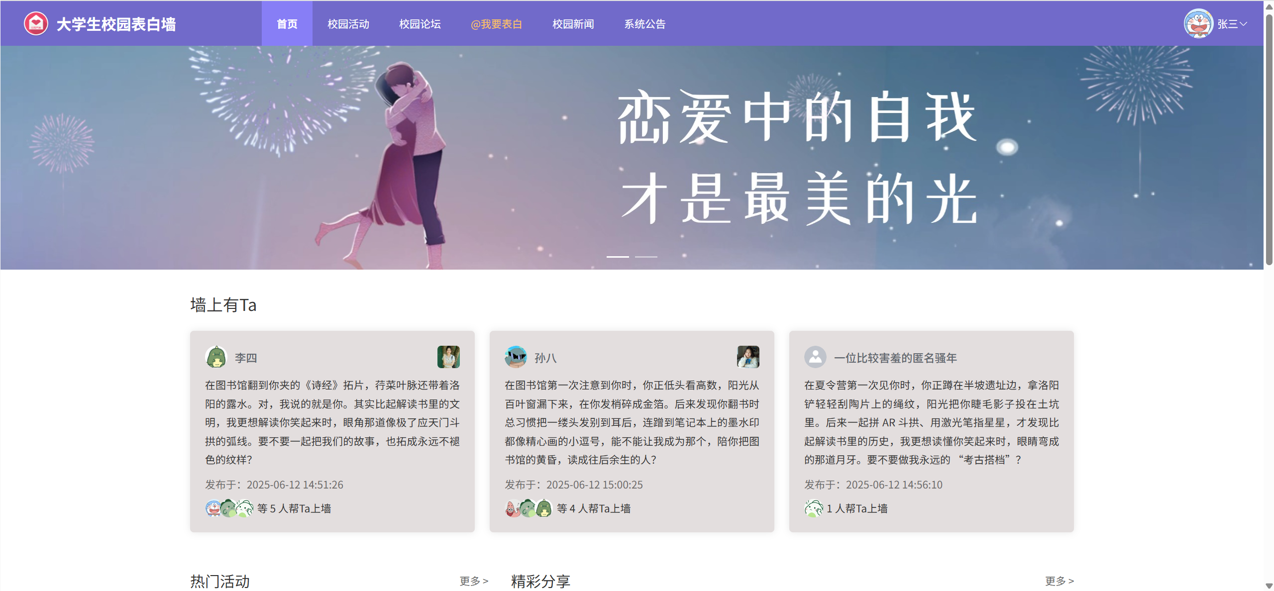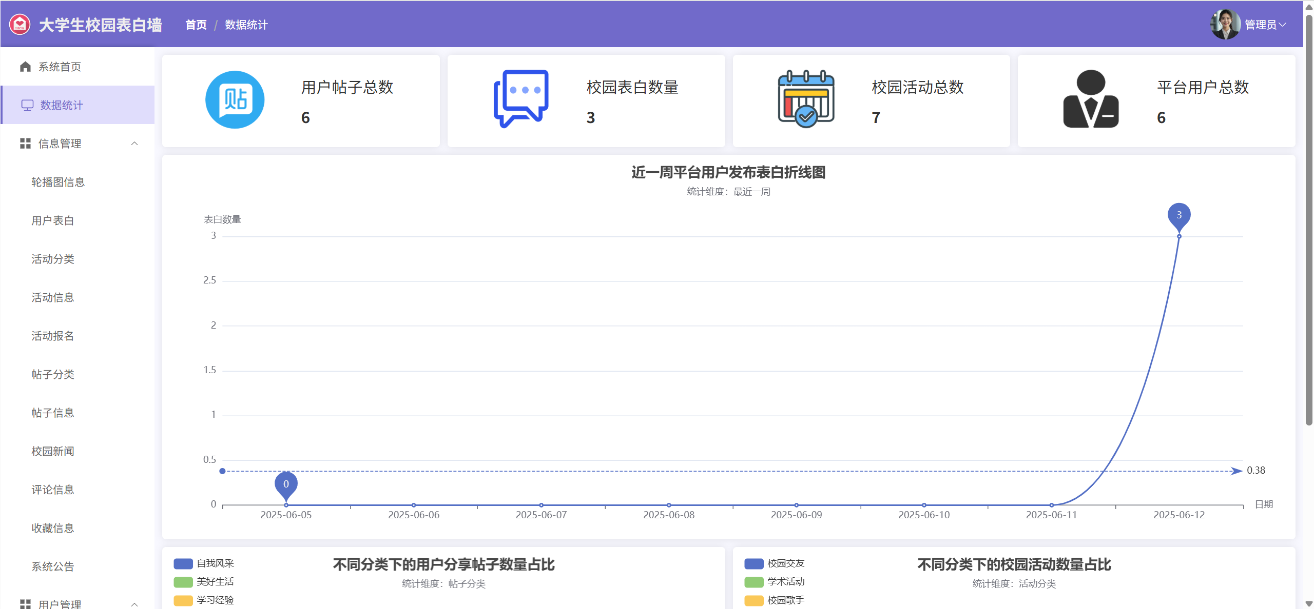 首页:浏览公告、统计平台注册人数、帖子数量、表白数据、帖子数据