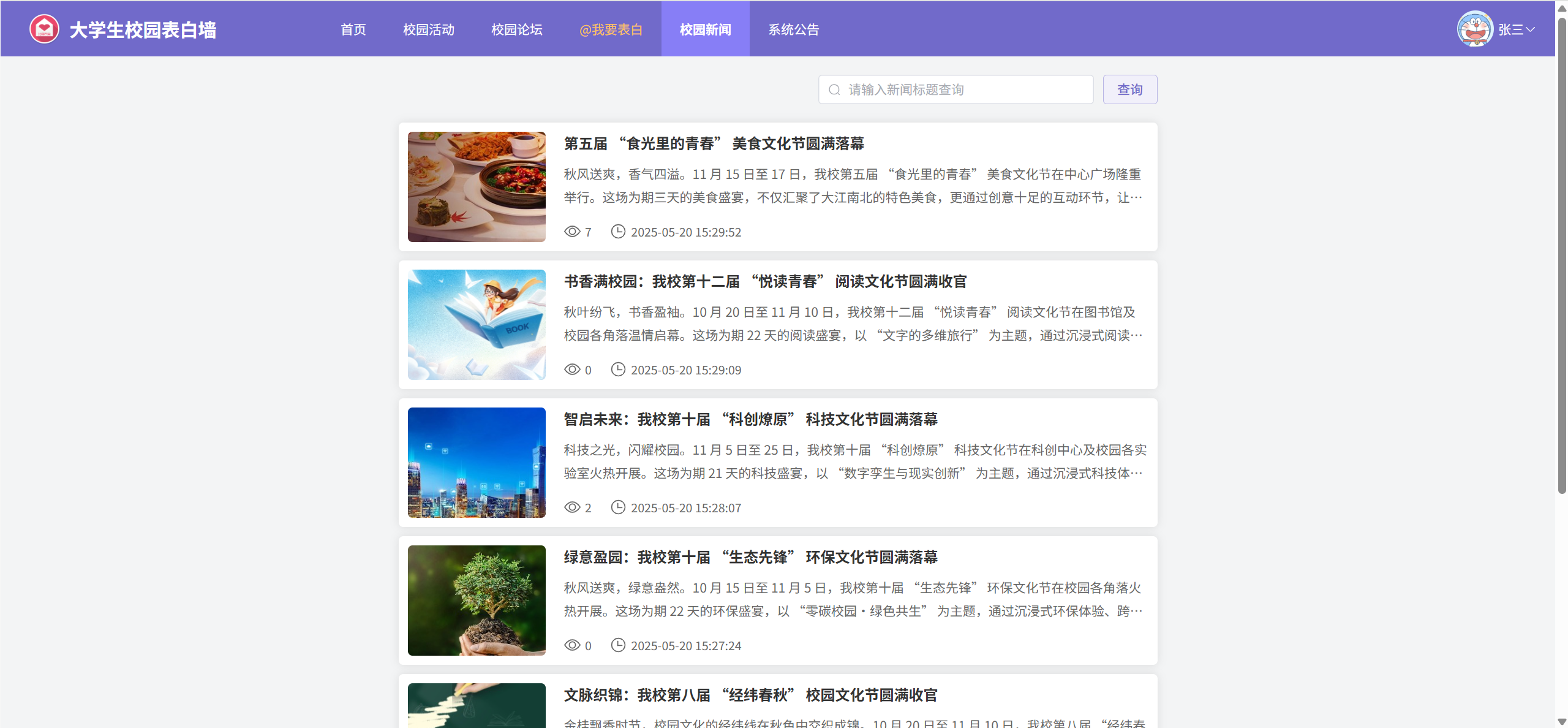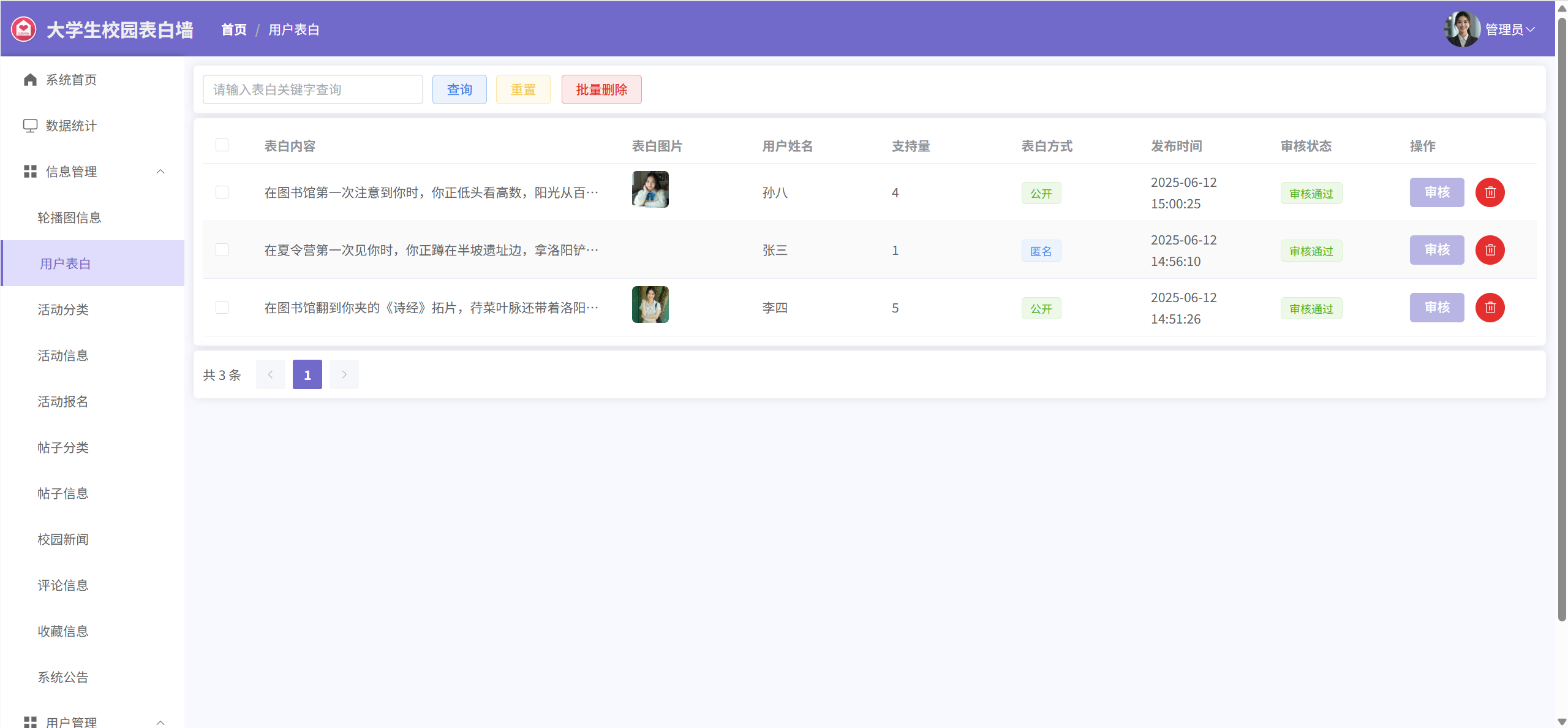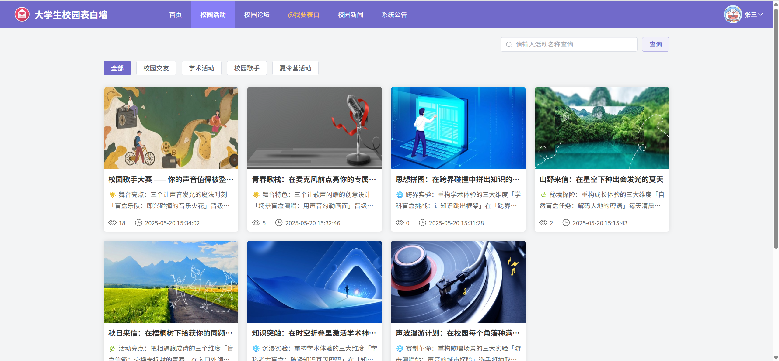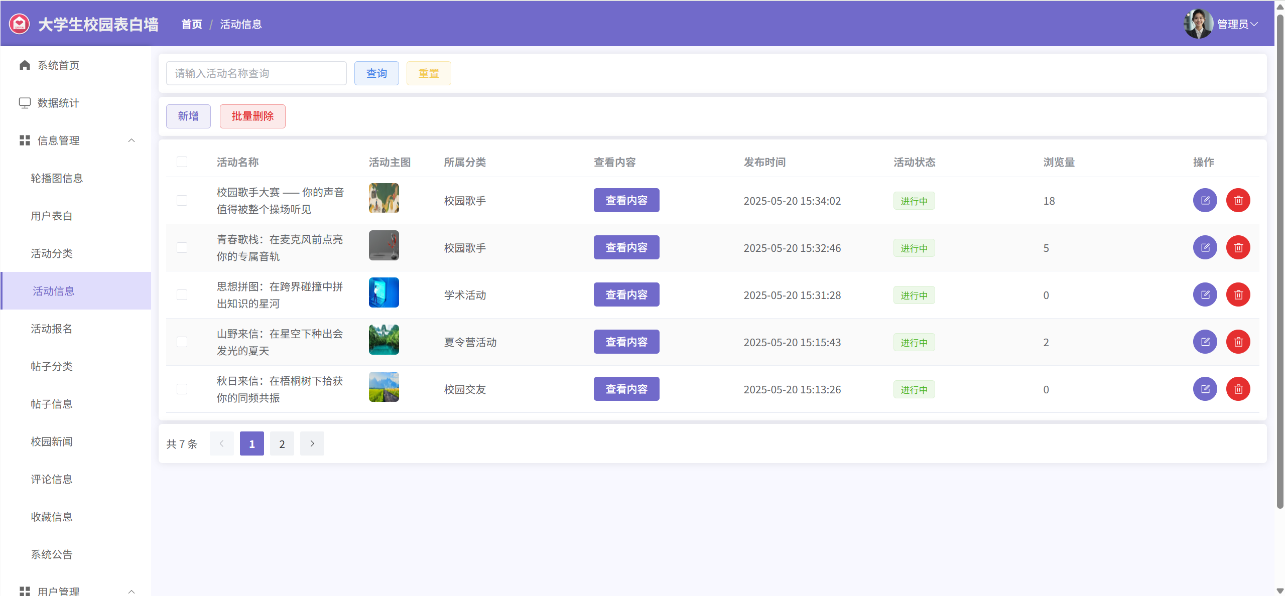 首页:浏览公告、统计平台注册人数、帖子数量、表白数据、帖子数据