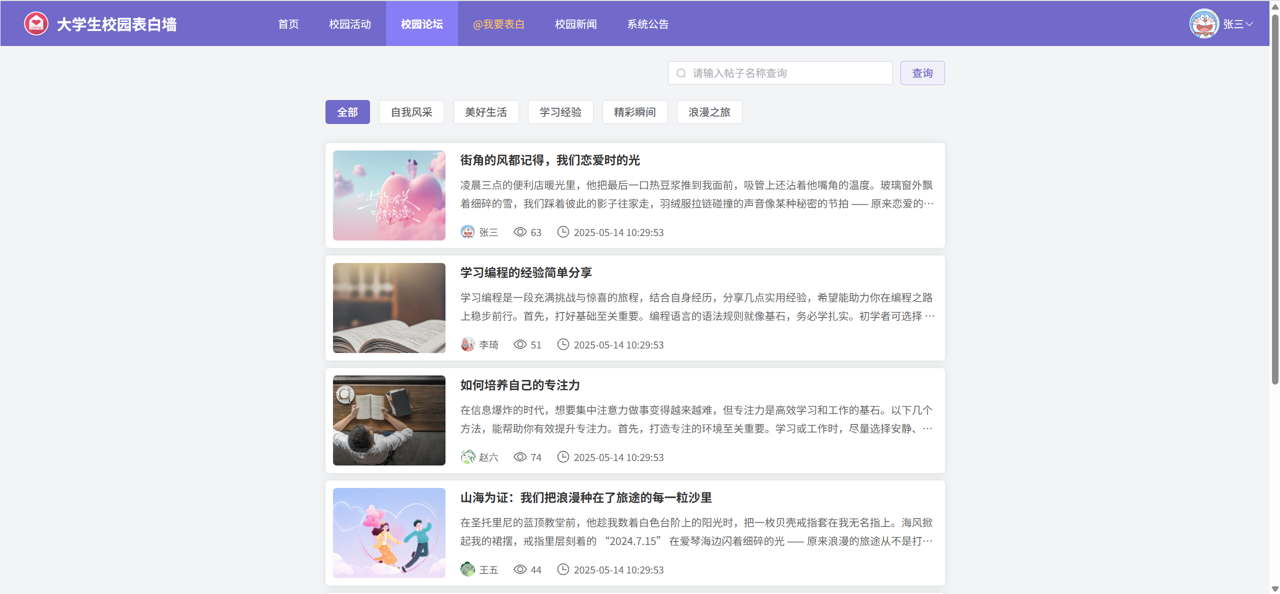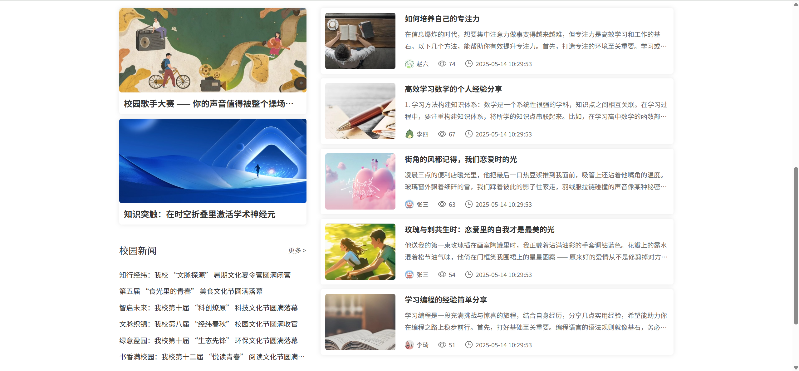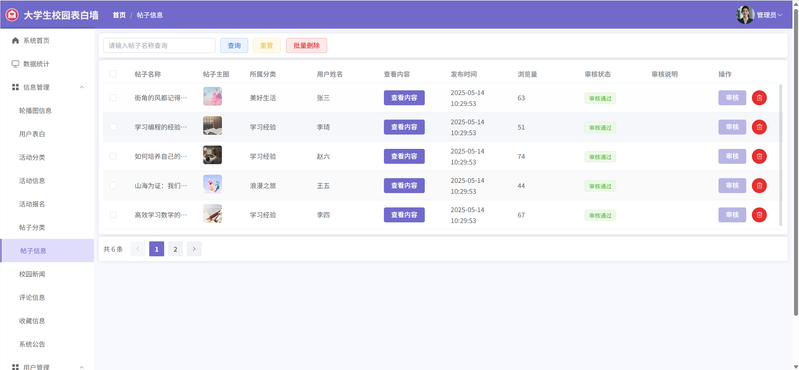 校园论坛:查看所有审核通过的帖子、评论、收藏