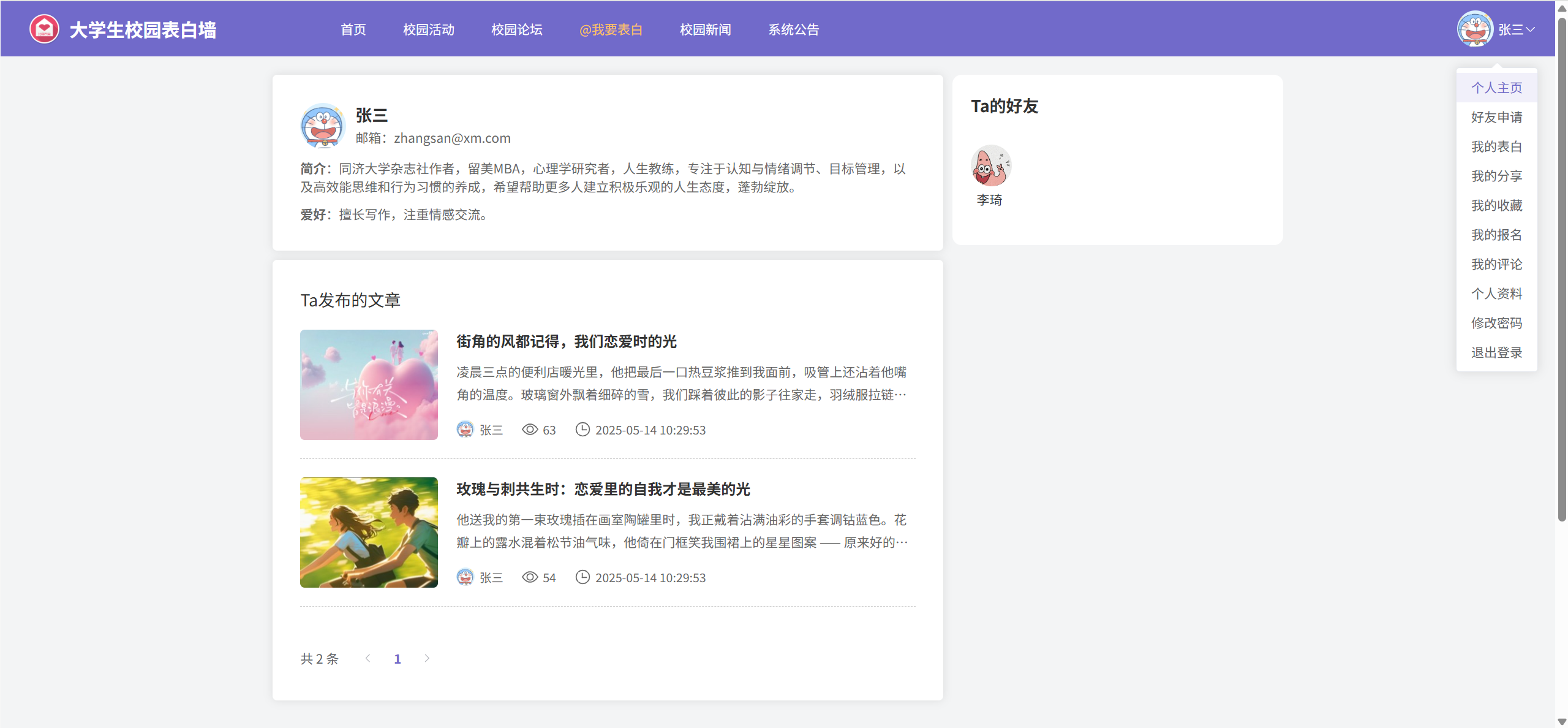 个人主页:查看个人简介、发布的帖子以及好友信息