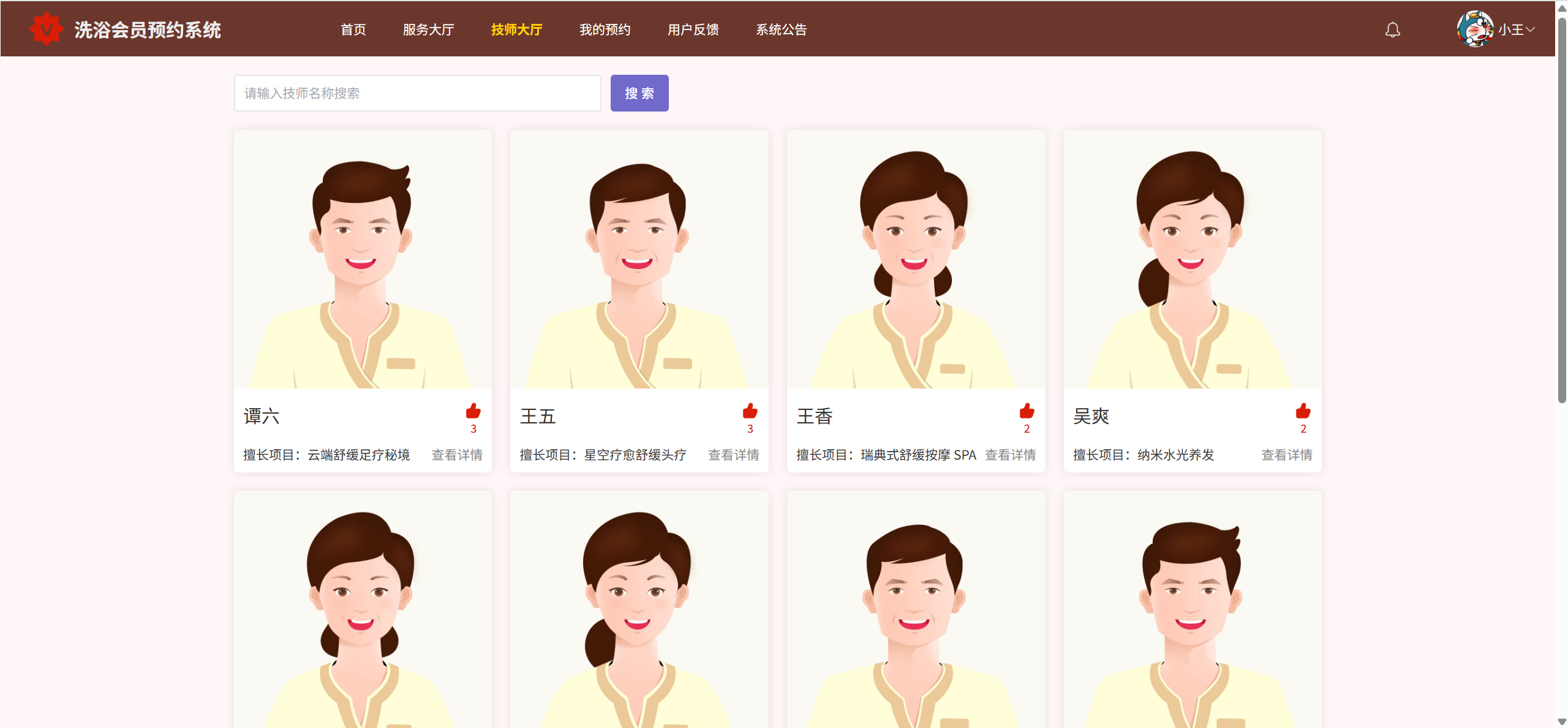 技师大厅:展示所有技师、点赞