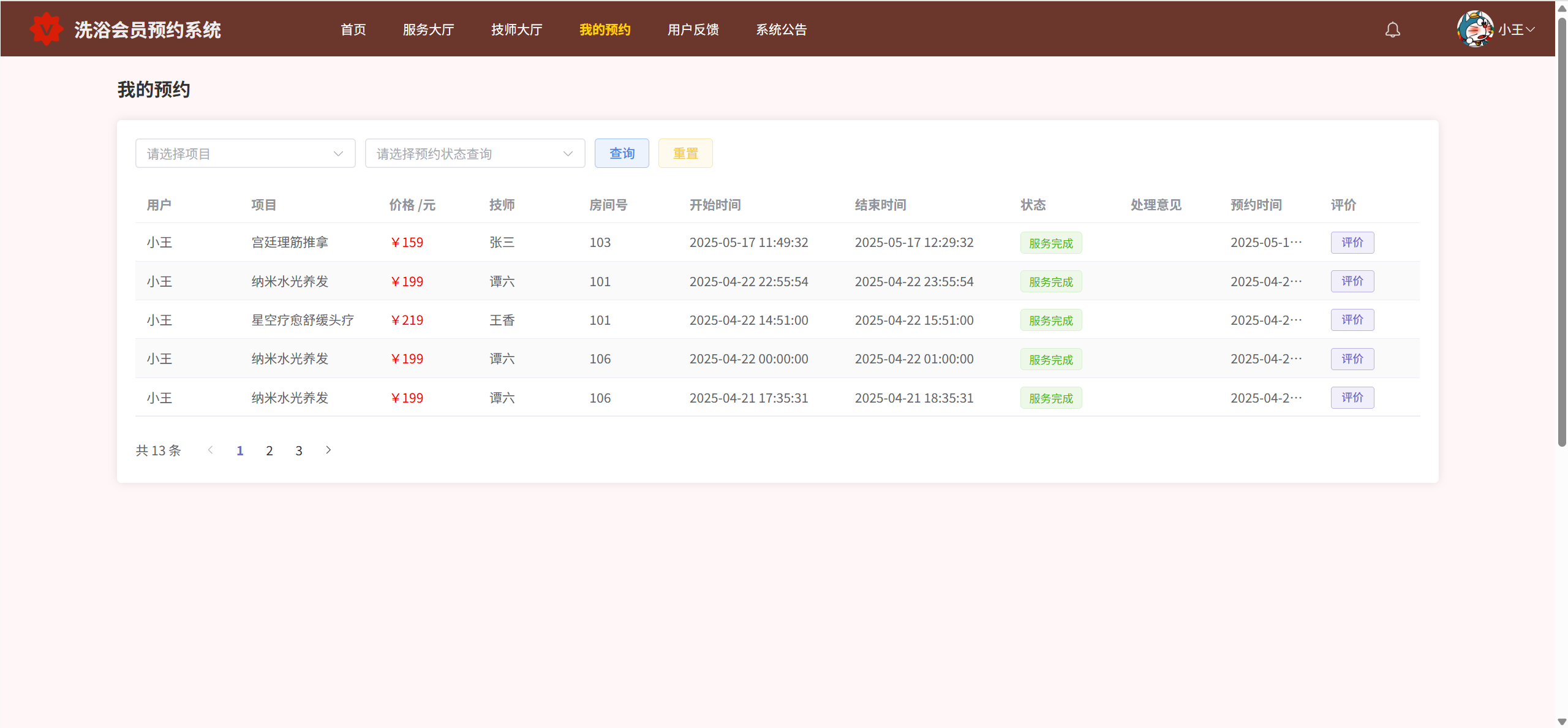 我的预约:查看我的所有预约项目、服务完成后对服务项目评价