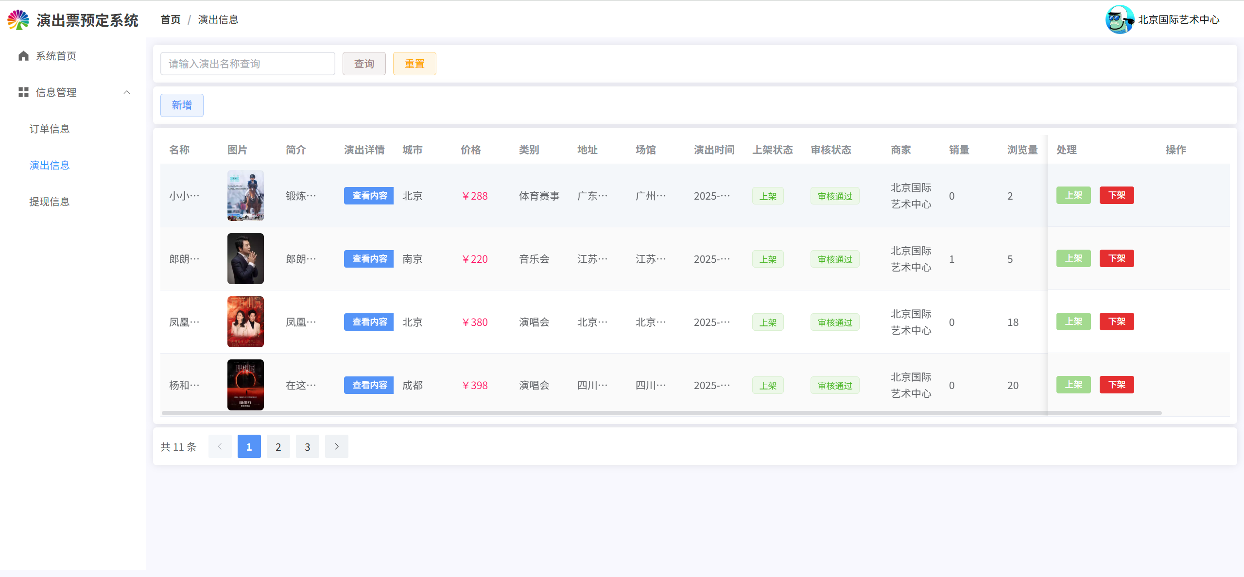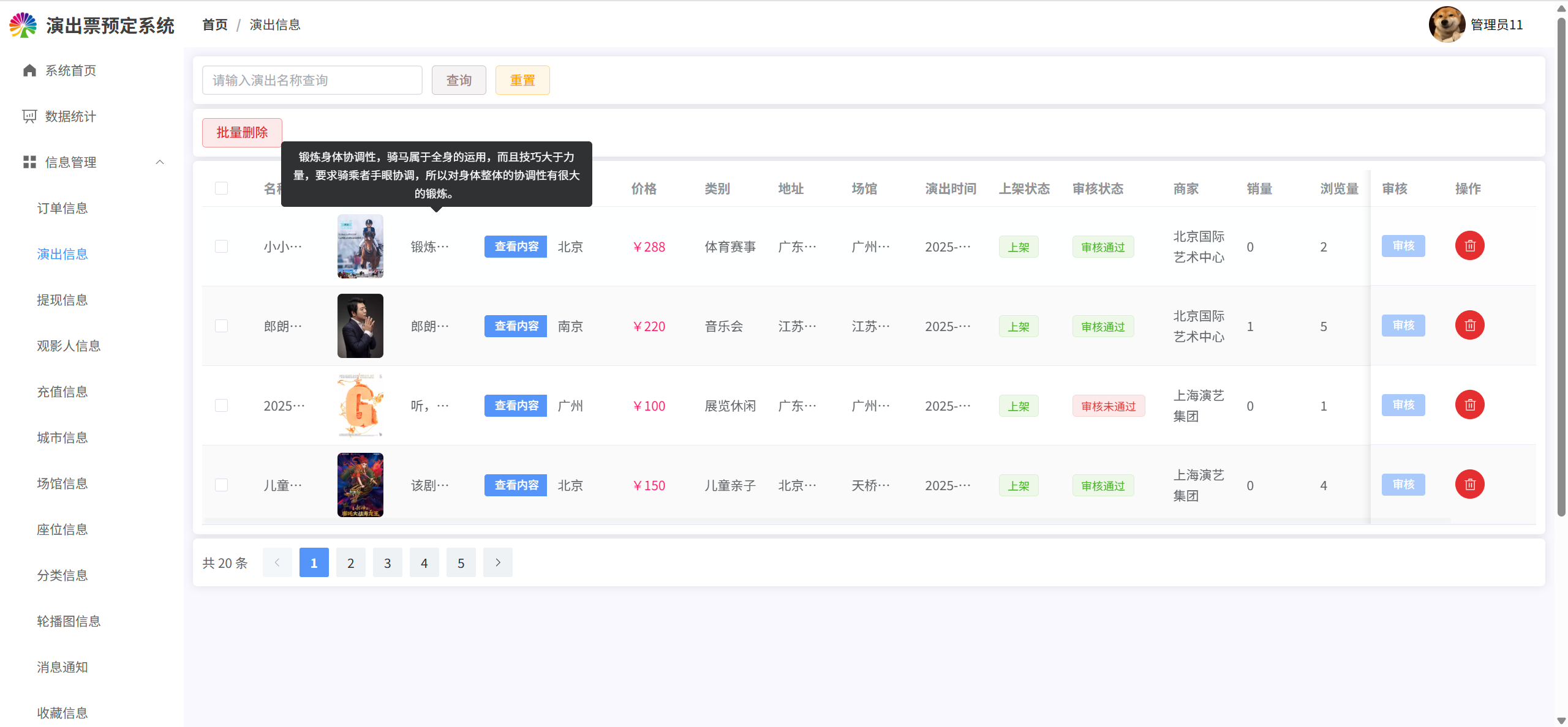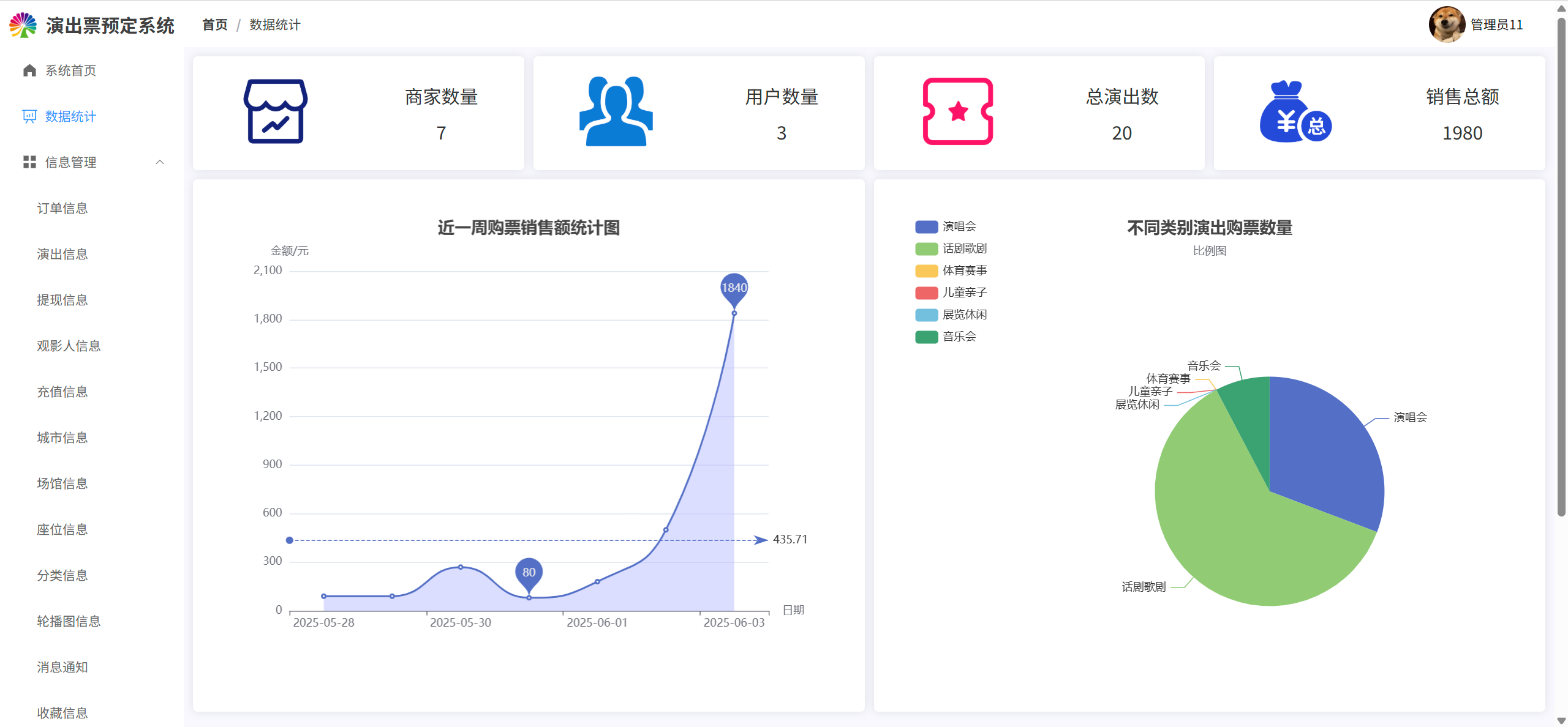 数据统计:显示4种统计数字、演出数量、销售总额、商家数量、用户数量。折线图(1周销售额)、饼图(分类演出数量比例)