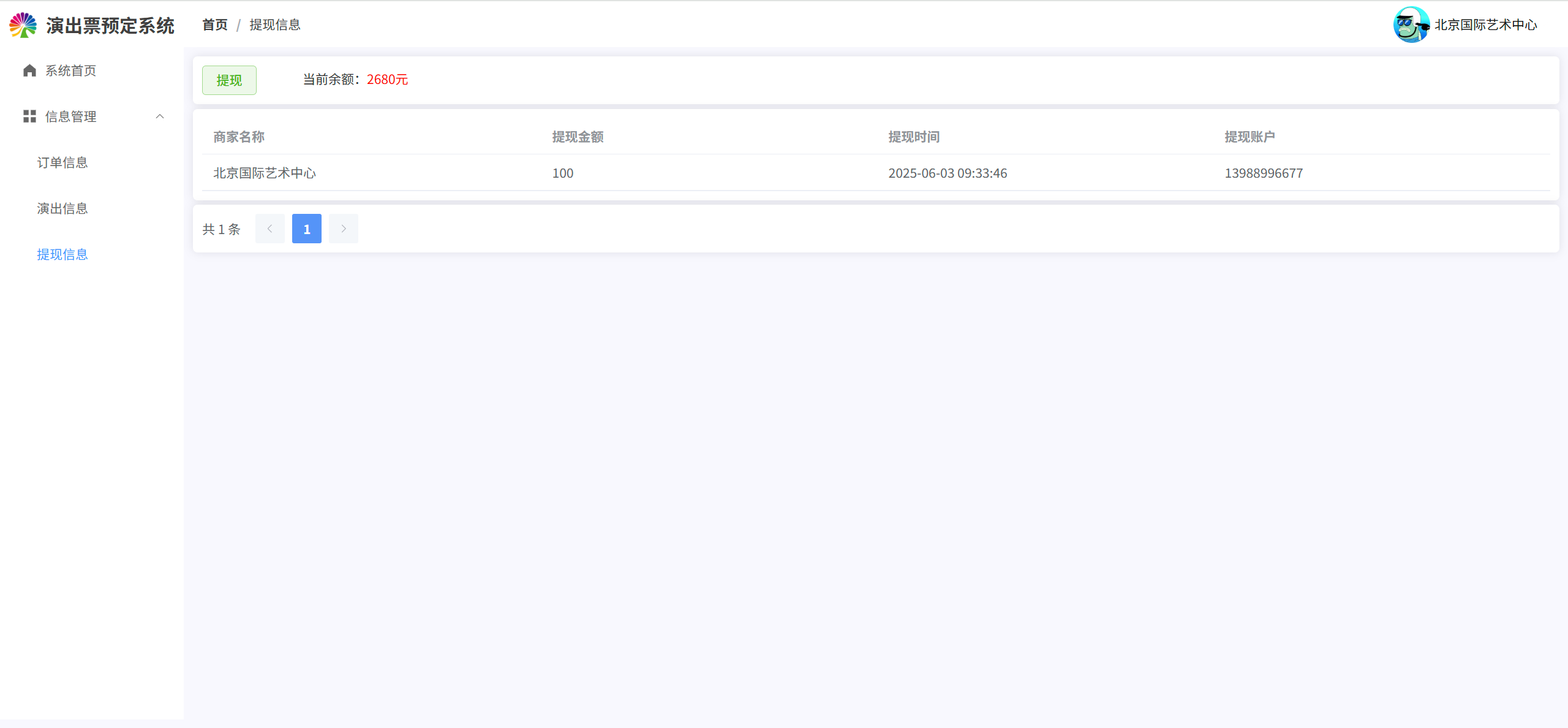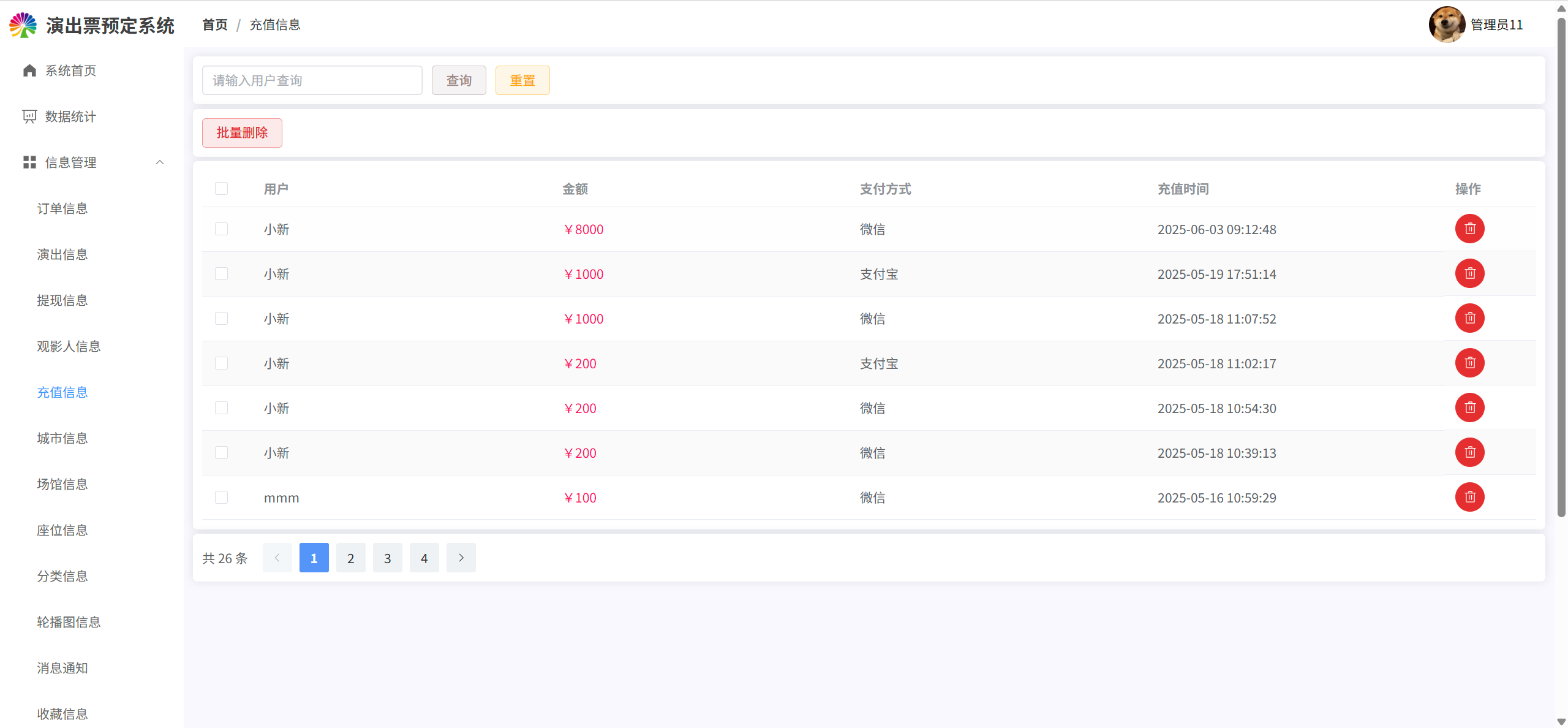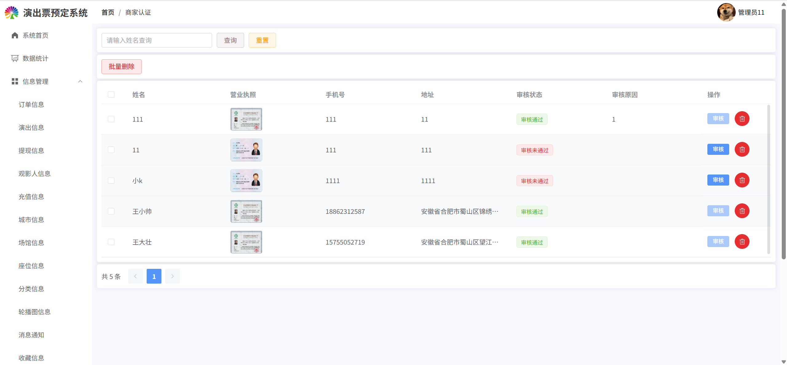 数据统计:显示4种统计数字、演出数量、销售总额、商家数量、用户数量。折线图(1周销售额)、饼图(分类演出数量比例)