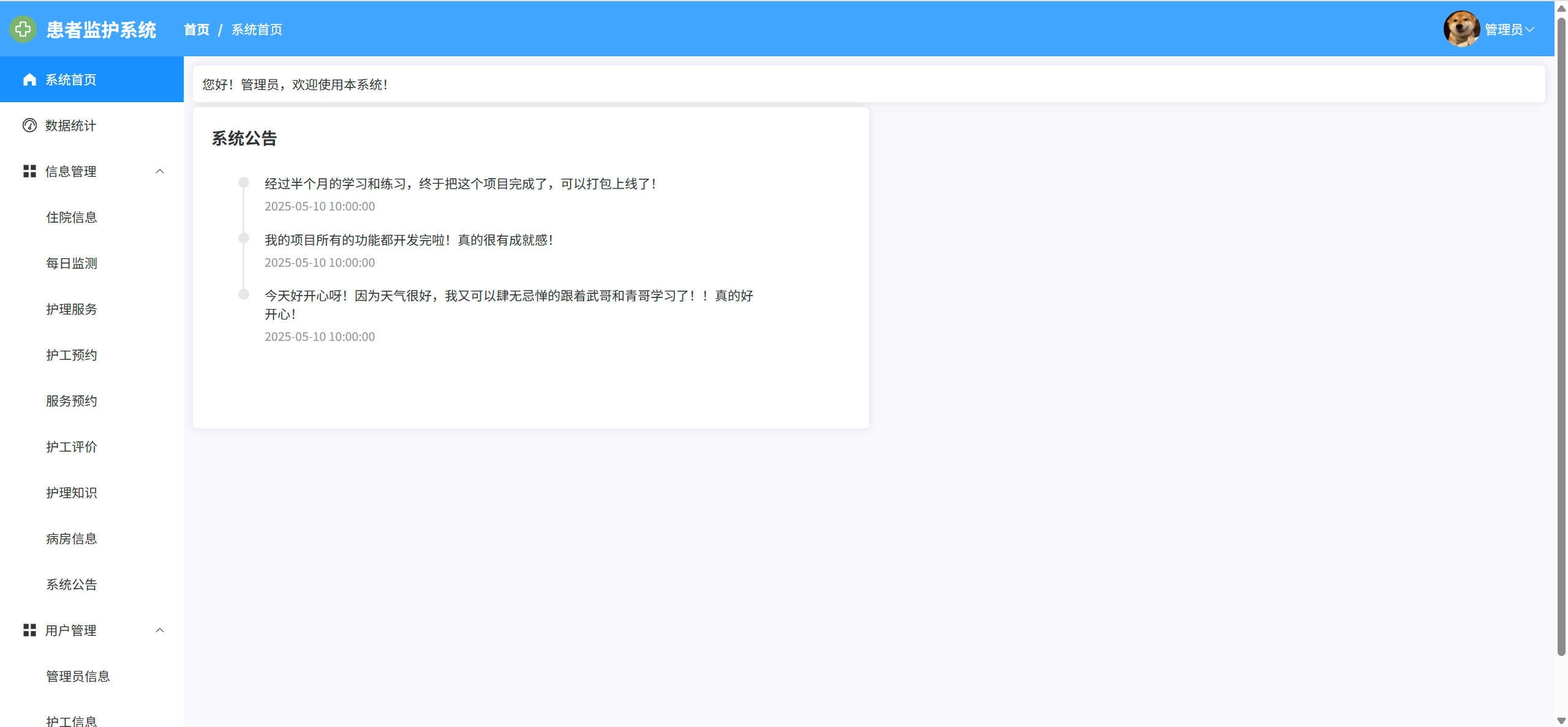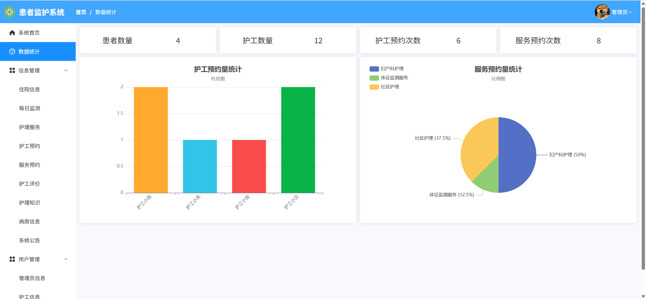 数据统计:查看系统各种指标数据、查看护工和护理服务的预约情况统计图