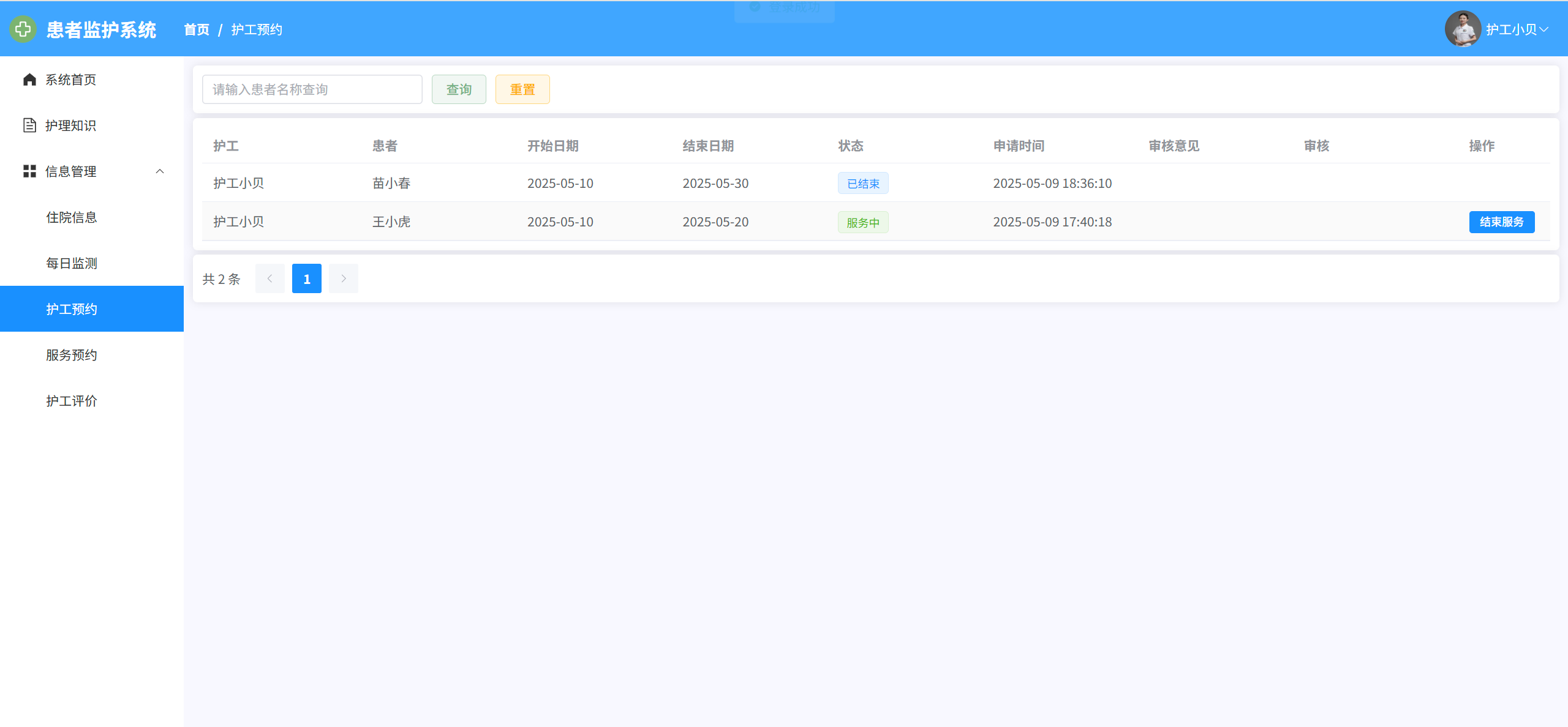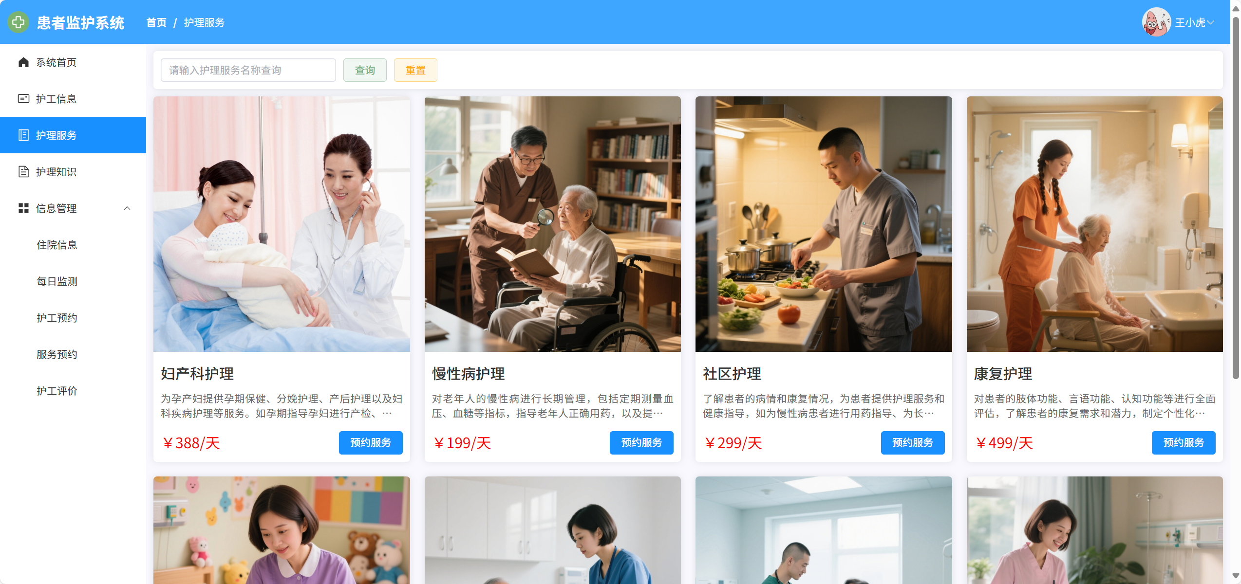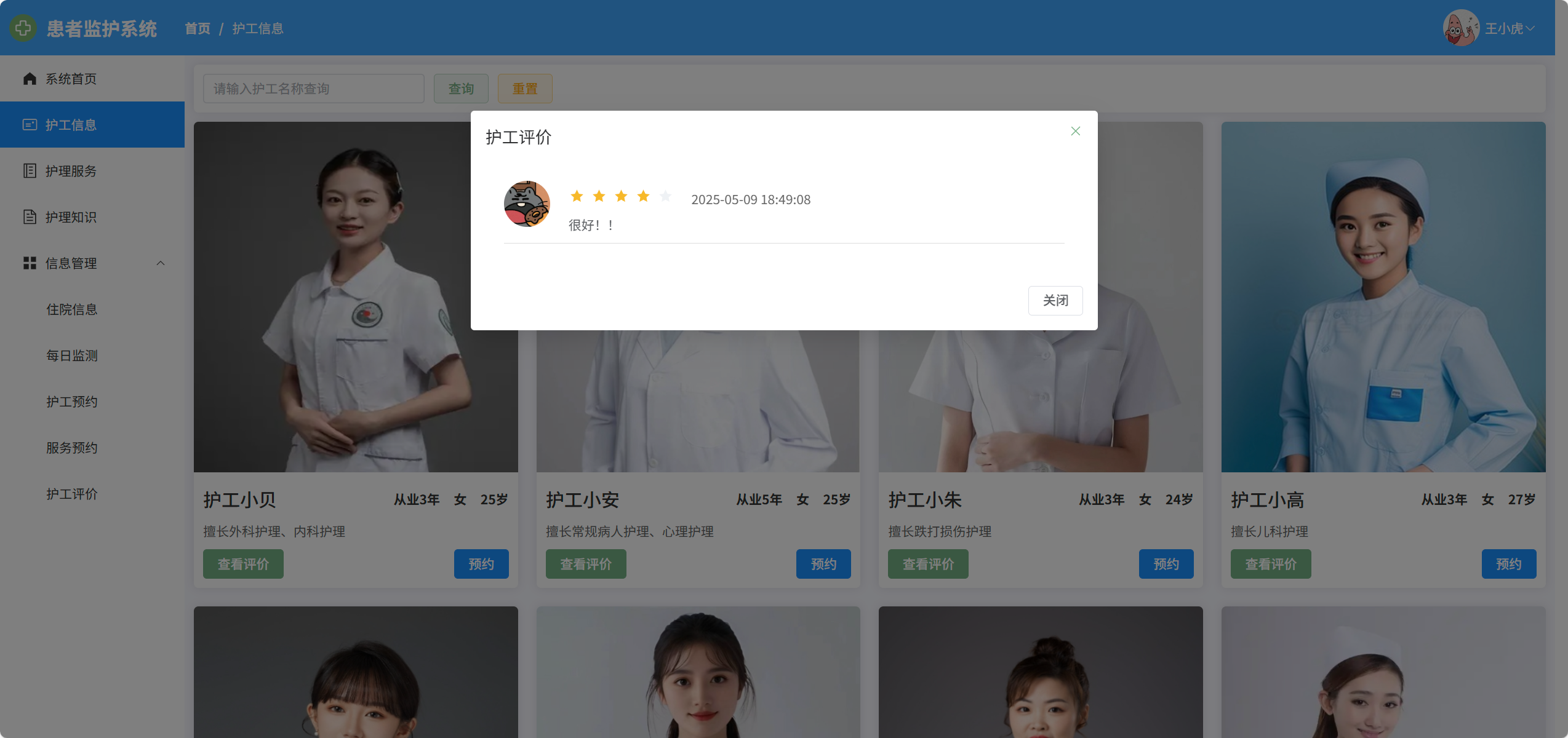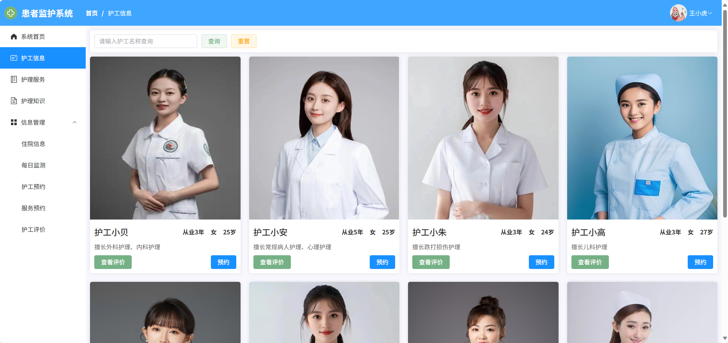 护工信息:查看所有护工信息,可预约、可查看护工评价