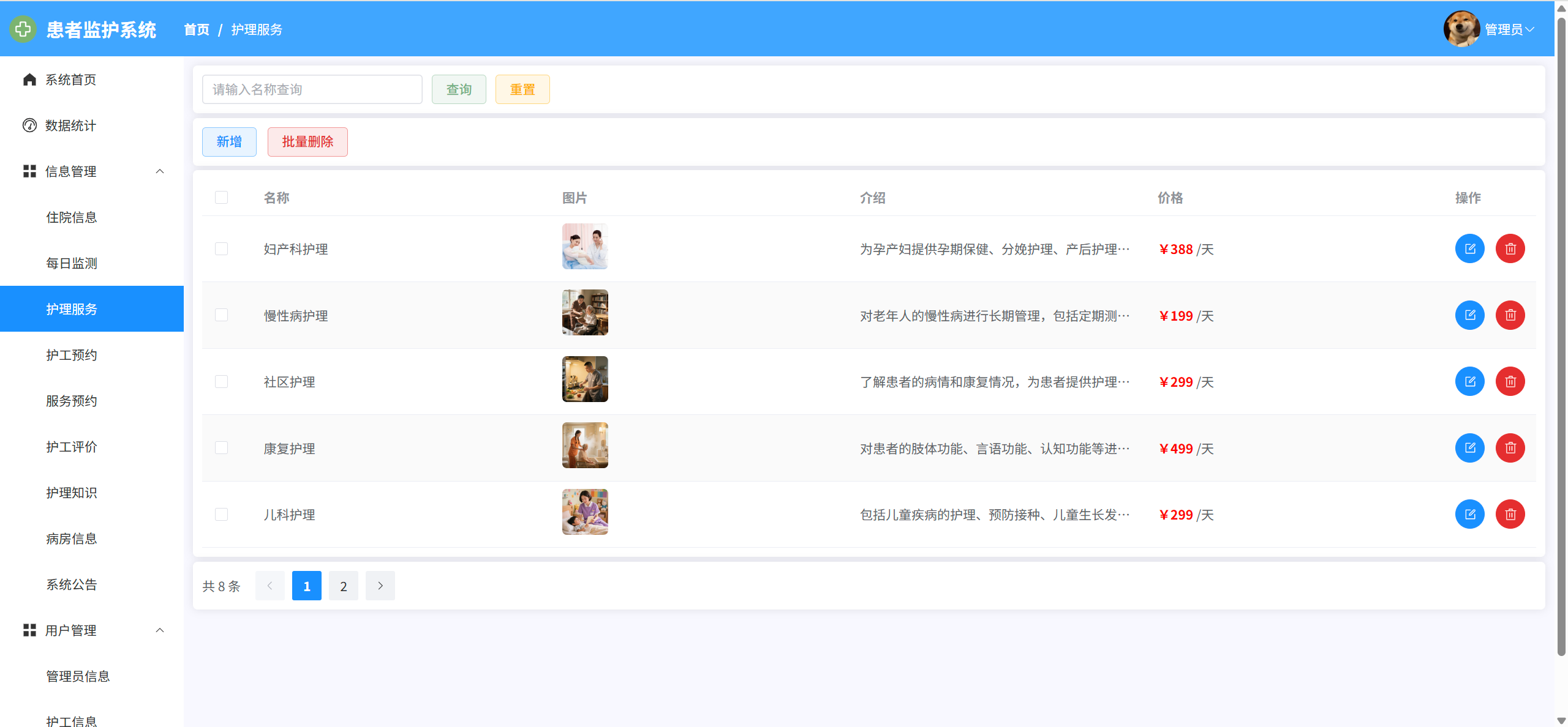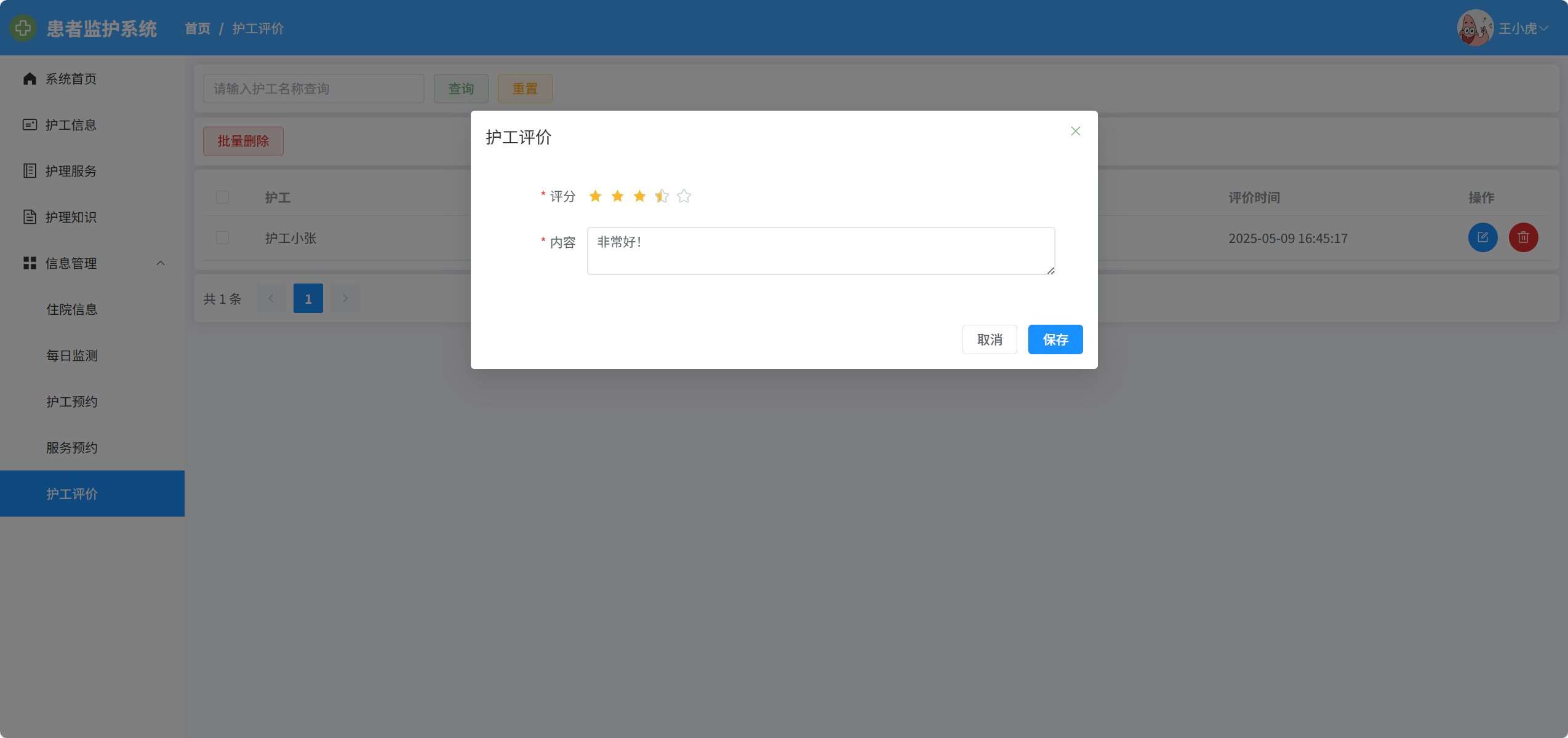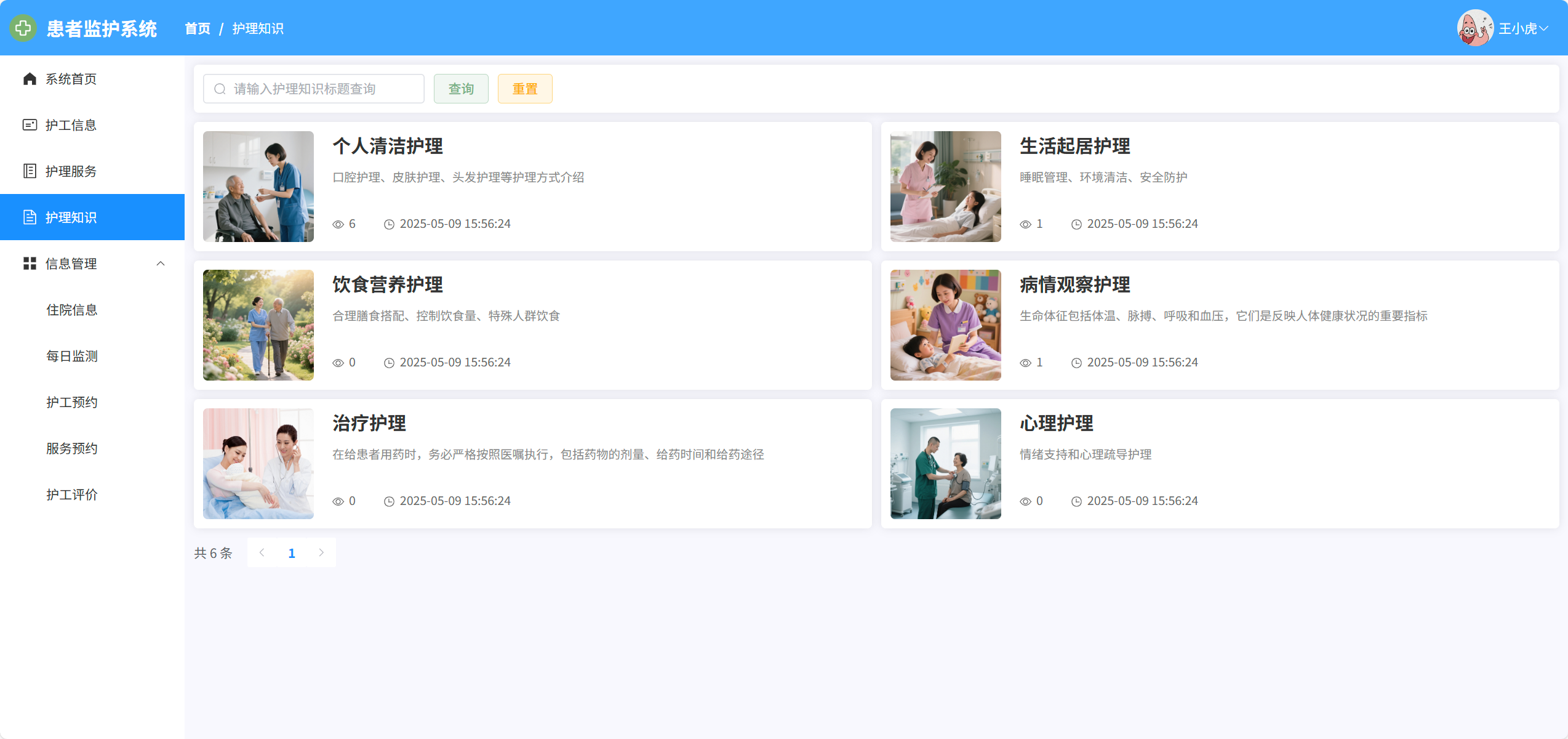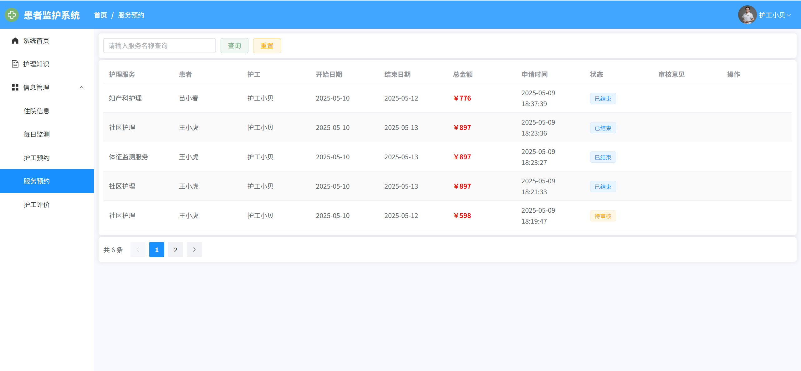 护工信息:查看所有护工信息,可预约、可查看护工评价