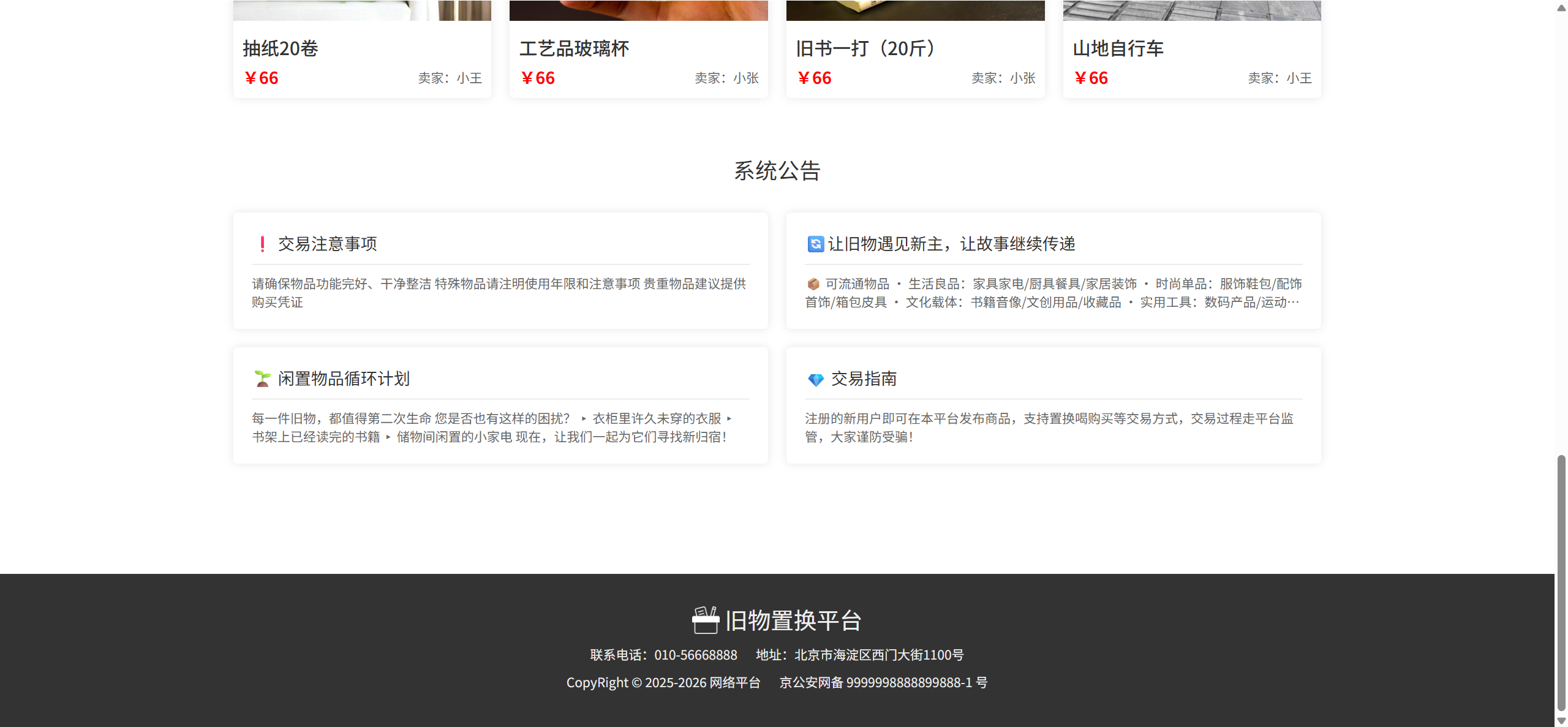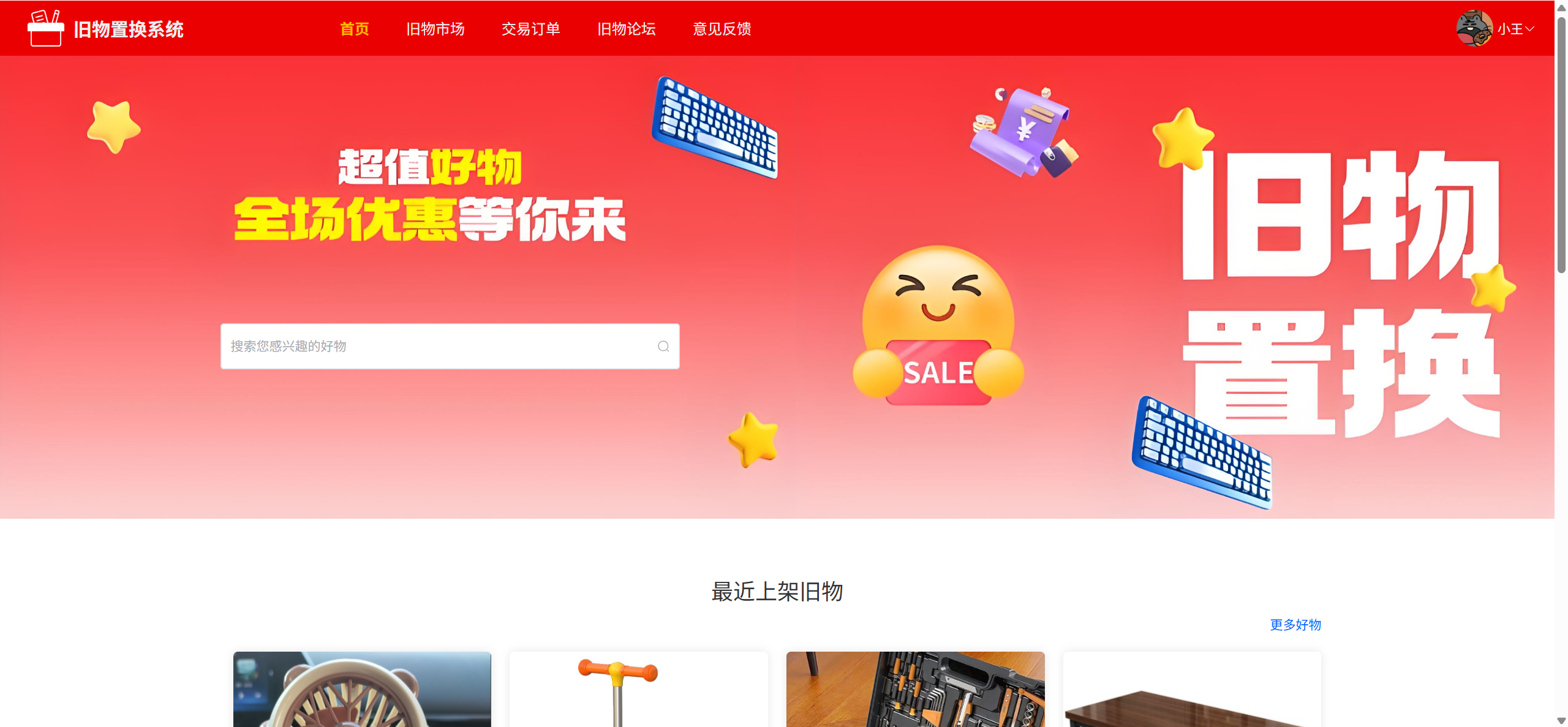 首页:搜索旧物、最新旧物展示、展示系统公告