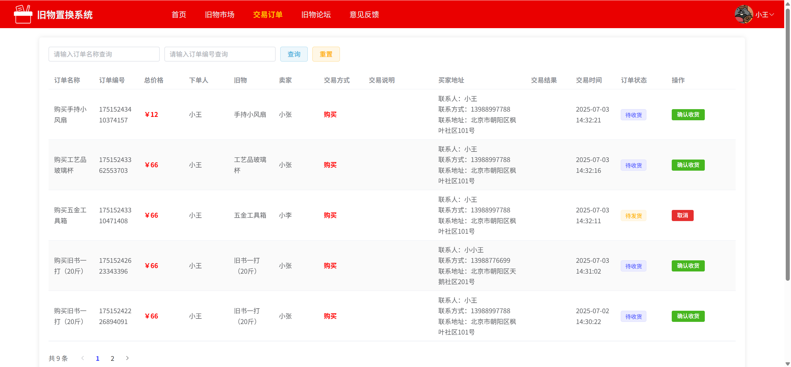 交易订单:查看自己交易的旧物订单(购买的旧物和卖出的旧物)、可发货、可取消